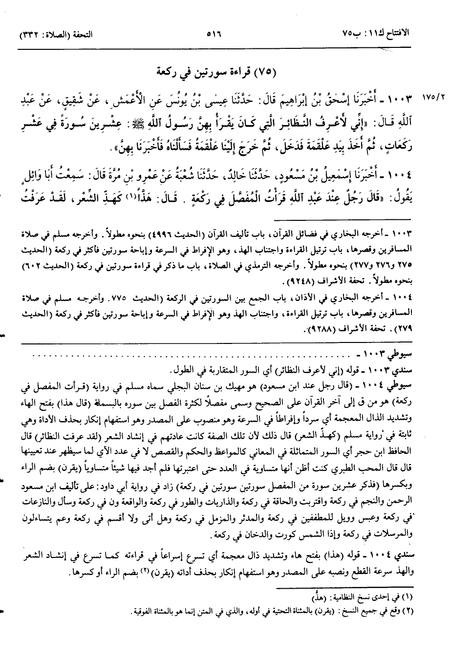 1004 - أَخْبَرَنَا إِسْمَعِيلُ بْنُ مَسْعُودٍ قَالَ حَدَّثَنَا خَالِدٌ قَالَ حَدَّثَنَا شُعْبَةُ عَنْ عَمْرِو بْنِ مُرَّةَ قَالَ سَمِعْتُ أَبَا وَائِلٍ يَقُولُ قَالَ رَجُلٌ عِنْدَ عَبْدِ اللَّهِ قَرَأْتُ الْمُفَصَّلَ فِي رَكْعَةٍ قَالَ هَذًّا كَهَذِّ الشِّعْرِ لَقَدْ عَرَفْتُ النَّظَائِرَ الَّتِي كَانَ رَسُولُ اللَّهِ صَلَّى اللَّهُ عَلَيْهِ وَسَلَّمَ يَقْرُنُ بَيْنَهُنَّ فَذَكَرَ عِشْرِينَ سُورَةً مِنْ الْمُفَصَّلِ سُورَتَيْنِ سُورَتَيْنِ فِي رَكْعَةٍ