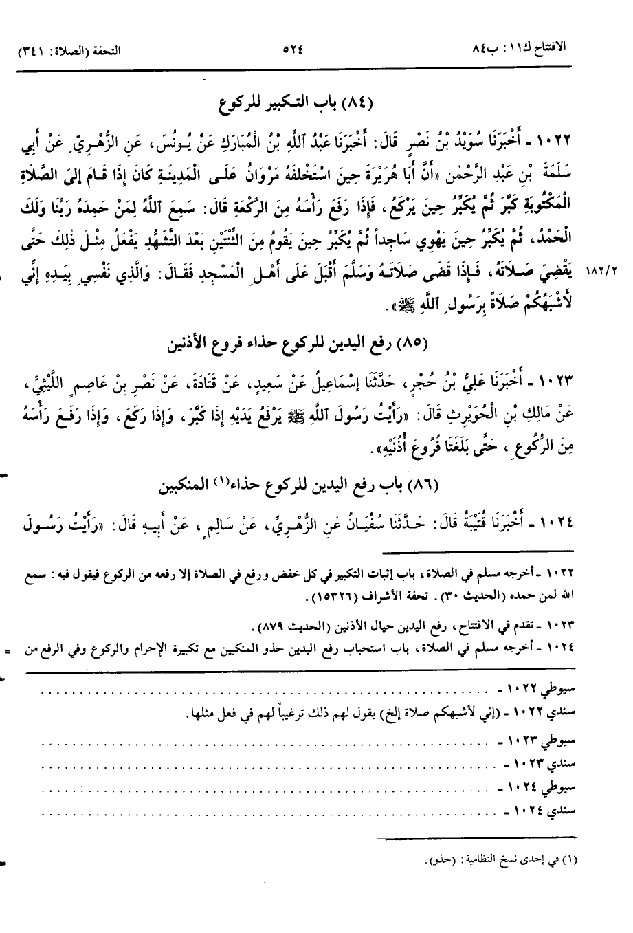 بَاب رَفْعِ الْيَدَيْنِ لِلرُّكُوعِ حِذَاءَ الْمَنْكِبَيْنِ 1024 - أَخْبَرَنَا قُتَيْبَةُ قَالَ حَدَّثَنَا سُفْيَانُ عَنْ الزُّهْرِيِّ عَنْ سَالِمٍ عَنْ أَبِيهِ قَالَ رَأَيْتُ رَسُولَ اللَّهِ صَلَّى اللَّهُ عَلَيْهِ وَسَلَّمَ إِذَا افْتَتَحَ الصَّلَاةَ يَرْفَعُ يَدَيْهِ حَتَّى يُحَاذِيَ مَنْكِبَيْهِ وَإِذَا رَكَعَ وَإِذَا رَفَعَ رَأْسَهُ مِنْ الرُّكُوعِ