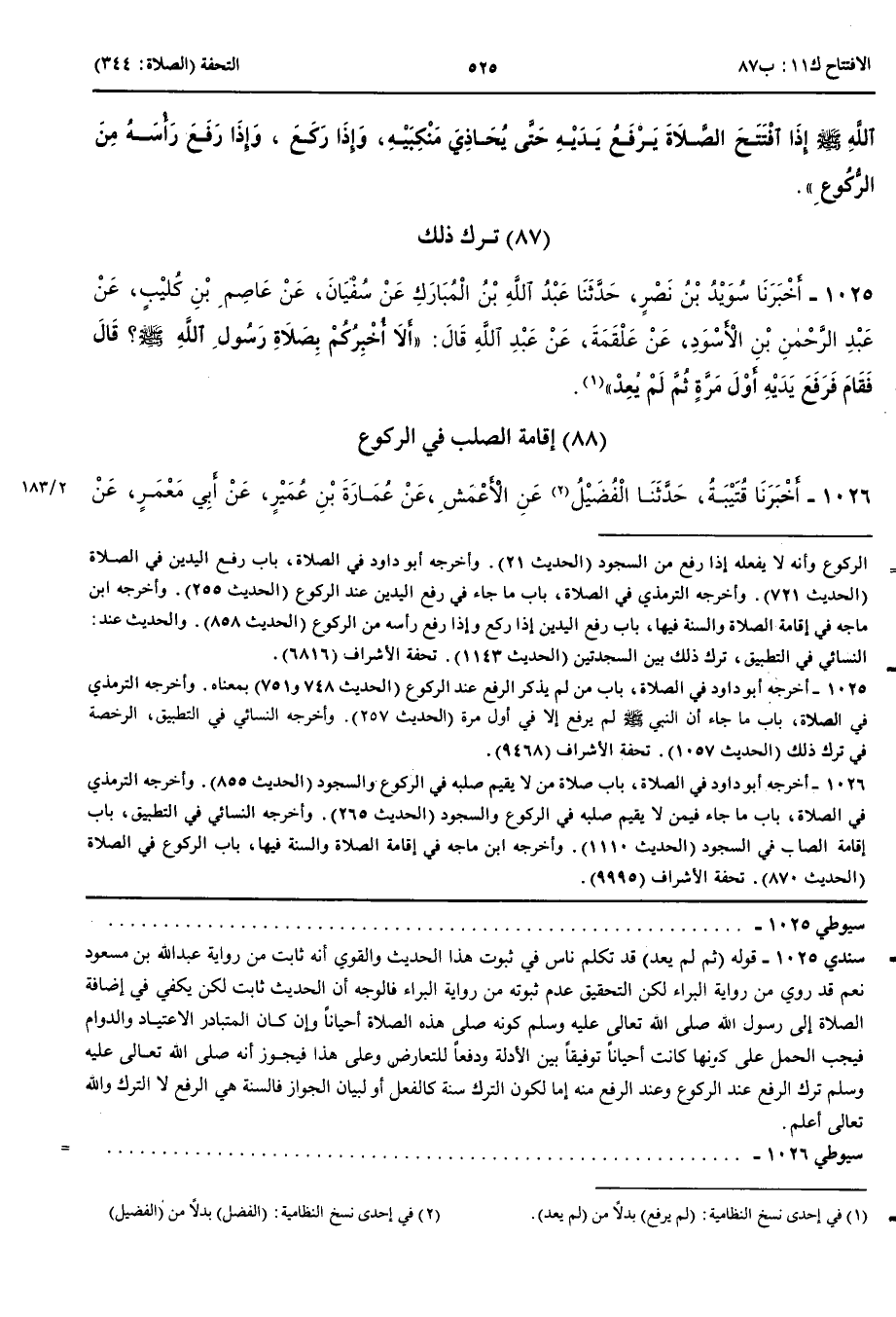 تَرْكُ ذَلِكَ 1025 - أَخْبَرَنَا سُوَيْدُ بْنُ نَصْرٍ قَالَ أَنْبَأَنَا عَبْدُ اللَّهِ بْنُ الْمُبَارَكِ عَنْ سُفْيَانَ عَنْ عَاصِمِ بْنِ كُلَيْبٍ عَنْ عَبْدِ الرَّحْمَنِ بْنِ الْأَسْوَدِ عَنْ عَلْقَمَةَ عَنْ عَبْدِ اللَّهِ قَالَ أَلَا أُخْبِرُكُمْ بِصَلَاةِ رَسُولِ اللَّهِ صَلَّى اللَّهُ عَلَيْهِ وَسَلَّمَ قَالَ فَقَامَ فَرَفَعَ يَدَيْهِ أَوَّلَ مَرَّةٍ ثُمَّ لَمْ يُعِدْ