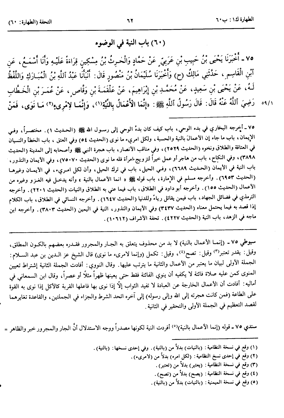 بَاب النِّيَةِ فِي الْوُضُوءِ 75 - أَخْبَرَنَا يَحْيَى بْنُ حَبِيبِ بْنِ عَرَبِيٍّ عَنْ حَمَّادٍ وَالْحَارِثُ بْنُ مِسْكِينٍ قِرَاءَةً عَلَيْهِ وَأَنَا أَسْمَعُ عَنْ ابْنِ الْقَاسِمِ حَدَّثَنِي مَالِكٌ ح و أَخْبَرَنَا سُلَيْمَانُ بْنُ مَنْصُورٍ قَالَ أَنْبَأَنَا عَبْدُ اللَّهِ بْنُ الْمُبَارَكِ وَاللَّفْظُ لَهُ عَنْ يَحْيَى بْنِ سَعِيدٍ عَنْ مُحَمَّدِ بْنِ إِبْرَاهِيمَ عَنْ عَلْقَمَةَ بْنِ وَقَّاصٍ عَنْ عُمَرَ بْنِ الْخَطَّابِ رَضِيَ اللَّهُ عَنْهُ قَالَ قَالَ رَسُولُ اللَّهِ صَلَّى اللَّهُ عَلَيْهِ وَسَلَّمَ إِنَّمَا الْأَعْمَالُ بِالنِّيَّةِ وَإِنَّمَا لِامْرِئٍ مَا نَوَى فَمَنْ كَانَتْ هِجْرَتُهُ إِلَى اللَّهِ وَإِلَى رَسُولِهِ فَهِجْرَتُهُ إِلَى اللَّهِ وَإِلَى رَسُولِهِ وَمَنْ كَانَتْ هِجْرَتُهُ إِلَى دُنْيَا يُصِيبُهَا أَوْ امْرَأَةٍ يَنْكِحُهَا فَهِجْرَتُهُ إِلَى مَا هَاجَرَ إِلَيْهِ