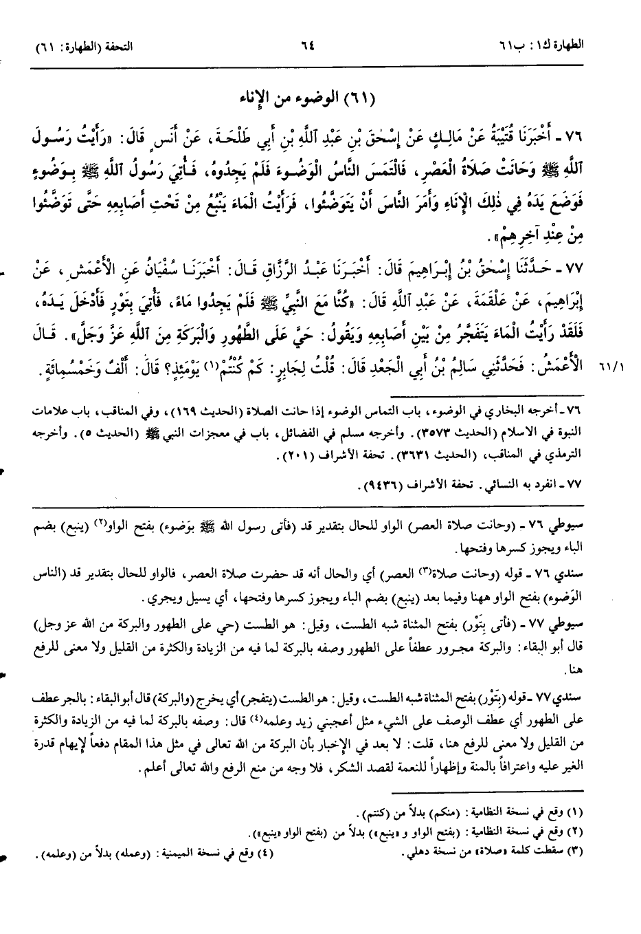 77 - أَخْبَرَنَا إِسْحَقُ بْنُ إِبْرَاهِيمَ قَالَ أَنْبَأَنَا عَبْدُ الرَّزَّاقِ قَالَ أَنْبَأَنَا سُفْيَانُ عَنْ الْأَعْمَشِ عَنْ إِبْرَاهِيمَ عَنْ عَلْقَمَةَ عَنْ عَبْدِ اللَّهِ قَالَ كُنَّا مَعَ النَّبِيِّ صَلَّى اللَّهُ عَلَيْهِ وَسَلَّمَ فَلَمْ يَجِدُوا مَاءً فَأُتِيَ بِتَوْرٍ فَأَدْخَلَ يَدَهُ فَلَقَدْ رَأَيْتُ الْمَاءَ يَتَفَجَّرُ مِنْ بَيْنِ أَصَابِعِهِ وَيَقُولُ حَيَّ عَلَى الطَّهُورِ وَالْبَرَكَةِ مِنْ اللَّهِ عَزَّ وَجَلَّ قَالَ الْأَعْمَشُ فَحَدَّثَنِي سَالِمُ بْنُ أَبِي الْجَعْدِ قَالَ قُلْتُ لِجَابِرٍ كَمْ كُنْتُمْ يَوْمَئِذٍ قَالَ أَلْفٌ وَخَمْسُ مِائَةٍ