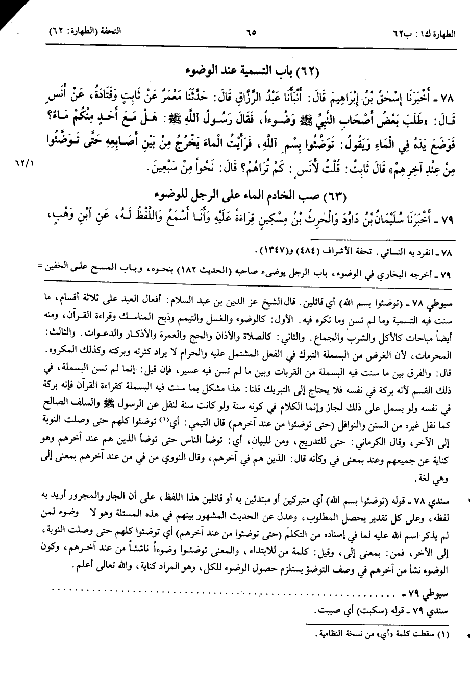 بَاب التَّسْمِيَةِ عِنْدَ الْوُضُوءِ 78 - أَخْبَرَنَا إِسْحَقُ بْنُ إِبْرَاهِيمَ قَالَ أَنْبَأَنَا عَبْدُ الرَّزَّاقِ قَالَ حَدَّثَنَا مَعْمَرٌ عَنْ ثَابِتٍ وَقَتَادَةُ عَنْ أَنَسٍ قَالَ طَلَبَ بَعْضُ أَصْحَابِ النَّبِيِّ صَلَّى اللَّهُ عَلَيْهِ وَسَلَّمَ وَضُوءًا فَقَالَ رَسُولُ اللَّهِ صَلَّى اللَّهُ عَلَيْهِ وَسَلَّمَ هَلْ مَعَ أَحَدٍ مِنْكُمْ مَاءٌ فَوَضَعَ يَدَهُ فِي الْمَاءِ وَيَقُولُ تَوَضَّئُوا بِسْمِ اللَّهِ فَرَأَيْتُ الْمَاءَ يَخْرُجُ مِنْ بَيْنِ أَصَابِعِهِ حَتَّى تَوَضَّئُوا مِنْ عِنْدِ آخِرِهِمْ قَالَ ثَابِتٌ قُلْتُ لِأَنَسٍ كَمْ تُرَاهُمْ قَالَ نَحْوًا مِنْ سَبْعِينَ