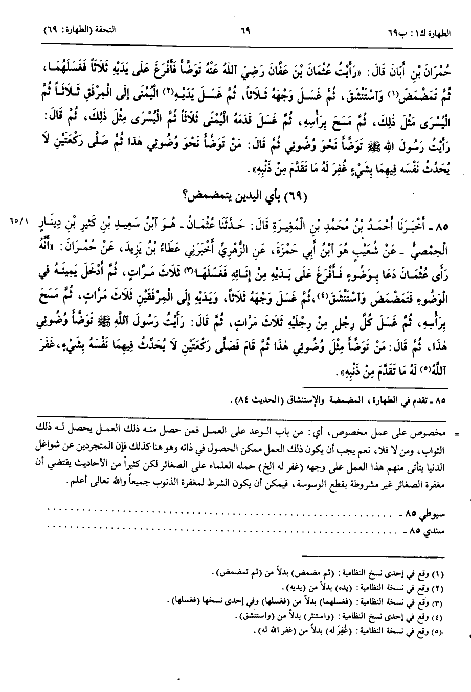 بِأَيِّ الْيَدَيْنِ يَتَمَضْمَضُ 85 - أَخْبَرَنَا أَحْمَدُ بْنُ مُحَمَّدِ بْنِ الْمُغِيرَةِ قَالَ حَدَّثَنَا عُثْمَانُ هُوَ ابْنُ سَعِيدِ بْنِ كَثِيرِ بْنِ دِينَارٍ الْحِمْصِيُّ عَنْ شُعَيْبٍ هُوَ ابْنُ أبِي حَمْزَةَ عَنْ الزُّهْرِيِّ أَخْبَرَنِي عَطَاءُ بْنُ يَزِيدَ عَنْ حُمْرَانَ أَنَّهُ رَأَى عُثْمَانَ دَعَا بِوَضُوءٍ فَأَفْرَغَ عَلَى يَدَيْهِ مِنْ إِنَائِهِ فَغَسَلَهَا ثَلَاثَ مَرَّاتٍ ثُمَّ أَدْخَلَ يَمِينَهُ فِي الْوَضُوءِ فَتَمَضْمَضَ وَاسْتَنْشَقَ ثُمَّ غَسَلَ وَجْهَهُ ثَلَاثًا وَيَدَيْهِ إِلَى الْمِرْفَقَيْنِ ثَلَاثَ مَرَّاتٍ ثُمَّ مَسَحَ بِرَأْسِهِ ثُمَّ غَسَلَ كُلَّ رِجْلٍ مِنْ رِجْلَيْهِ ثَلَاثَ مَرَّاتٍ ثُمَّ قَالَ رَأَيْتُ رَسُولَ اللَّهِ صَلَّى اللَّهُ عَلَيْهِ وَسَلَّمَ تَوَضَّأَ وُضُوئِي هَذَا ثُمَّ قَالَ مَنْ تَوَضَّأَ مِثْلَ وُضُوئِي هَذَا ثُمَّ قَامَ فَصَلَّى رَكْعَتَيْنِ لَا يُحَدِّثُ فِيهِمَا نَفْسَهُ بِشَيْءٍ غَفَرَ اللَّهُ لَهُ مَا تَقَدَّمَ مِنْ ذَنْبِهِ