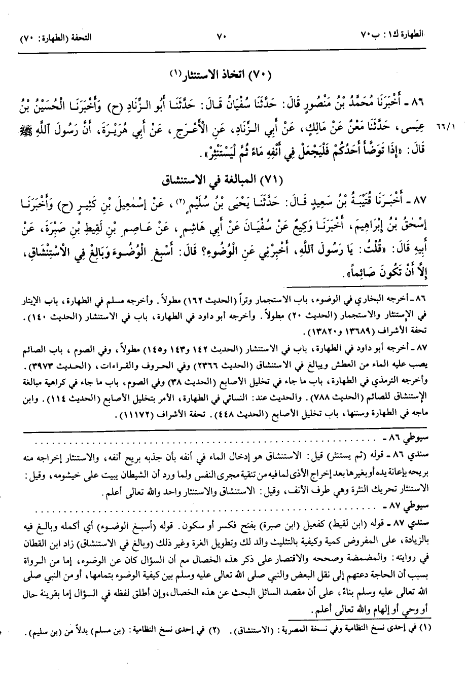 اتِّخَاذُ الِاسْتِنْثار 86 - أَخْبَرَنَا مُحَمَّدُ بْنُ مَنْصُورٍ قَالَ حَدَّثَنَا سُفْيَانُ قَالَ حَدَّثَنَا أَبُو الزِّنَادِ ح و حَدَّثَنَا الْحُسَيْنُ بْنُ عِيسَى عَنْ مَعْنٍ عَنْ مَالِكٍ عَنْ أَبِي الزِّنَادِ عَنْ الْأَعْرَجِ عَنْ أَبِي هُرَيْرَةَ أَنَّ رَسُولَ اللَّهِ صَلَّى اللَّهُ عَلَيْهِ وَسَلَّمَ قَالَ إِذَا تَوَضَّأَ أَحَدُكُمْ فَلْيَجْعَلْ فِي أَنْفِهِ مَاءً ثُمَّ لِيَسْتَنْثِرْ
