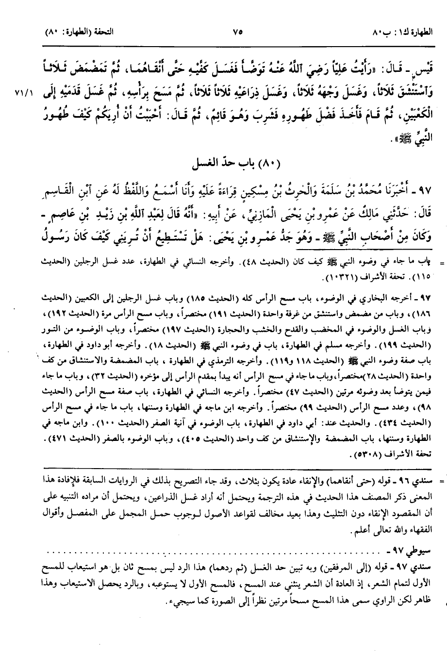 بَاب حَدِّ الْغَسْلِ 97 - أَخْبَرَنَا مُحَمَّدُ بْنُ سَلَمَةَ وَالْحَارِثُ بْنُ مِسْكِينٍ قِرَاءَةً عَلَيْهِ وَأَنَا أَسْمَعُ وَاللَّفْظُ لَهُ عَنْ ابْنِ الْقَاسِمِ قَالَ حَدَّثَنِي مَالِكٌ عَنْ عَمْرِو بْنِ يَحْيَى الْمَازِنِيِّ عَنْ أَبِيهِ أَنَّهُ قَالَ لِعَبْدِ اللَّهِ بْنِ زَيْدِ بْنِ عَاصِمٍ وَكَانَ مِنْ أَصْحَابِ النَّبِيِّ صَلَّى اللَّهُ عَلَيْهِ وَسَلَّمَ وَهُوَ جَدُّ عَمْرِو بْنِ يَحْيَى هَلْ تَسْتَطِيعُ أَنْ تُرِيَنِي كَيْفَ كَانَ رَسُولُ اللَّهِ صَلَّى اللَّهُ عَلَيْهِ وَسَلَّمَ يَتَوَضَّأُ قَالَ عَبْدُ اللَّهِ بْنُ زَيْدٍ نَعَمْ فَدَعَا بِوَضُوءٍ فَأَفْرَغَ عَلَى يَدَيْهِ فَغَسَلَ يَدَيْهِ مَرَّتَيْنِ مَرَّتَيْنِ ثُمَّ تَمَضْمَضَ وَاسْتَنْشَقَ ثَلَاثًا ثُمَّ غَسَلَ وَجْهَهُ ثَلَاثًا ثُمَّ غَسَلَ يَدَيْهِ مَرَّتَيْنِ مَرَّتَيْنِ إِلَى الْمِرْفَقَيْنِ ثُمَّ مَسَحَ رَأْسَهُ بِيَدَيْهِ فَأَقْبَلَ بِهِمَا وَأَدْبَرَ بَدَأَ بِمُقَدَّمِ رَأْسِهِ ثُمَّ ذَهَبَ بِهِمَا إِلَى قَفَاهُ ثُمَّ رَدَّهُمَا حَتَّى رَجَعَ إِلَى الْمَكَانِ الَّذِي بَدَأَ مِنْهُ ثُمَّ غَسَلَ رِجْلَيْهِ