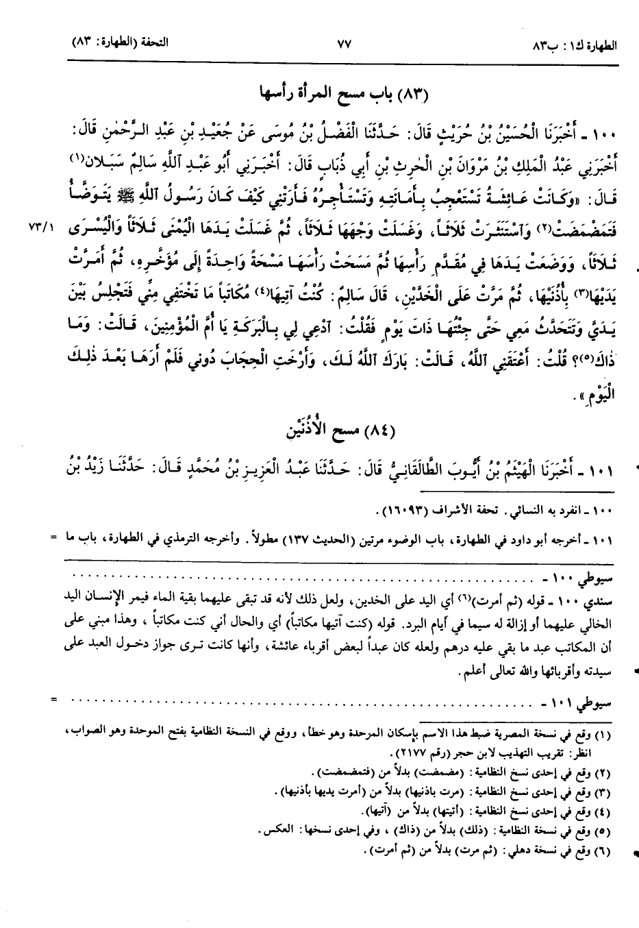 بَاب مَسْحِ الْمَرْأَةِ رَأْسَهَا 100 - أَخْبَرَنَا الْحُسَيْنُ بْنُ حُرَيْثٍ قَالَ حَدَّثَنَا الْفَضْلُ بْنُ مُوسَى عَنْ جُعَيْدِ بْنِ عَبْدِ الرَّحْمَنِ قَالَ أَخْبَرَنِي عَبْدُ الْمَلِكِ بْنُ مَرْوَانَ بْنِ الْحَارِثِ بْنِ أَبِي ذُنَابٍ قَالَ أَخْبَرَنِي أَبُو عَبْدِ اللَّهِ سَالِمٌ سَبَلَانُ قَالَ وَكَانَتْ عَائِشَةُ تَسْتَعْجِبُ بِأَمَانَتِهِ وَتَسْتَأْجِرُهُ فَأَرَتْنِي كَيْفَ كَانَ رَسُولُ اللَّهِ صَلَّى اللَّهُ عَلَيْهِ وَسَلَّمَ يَتَوَضَّأُ فَتَمَضْمَضَتْ وَاسْتَنْثَرَتْ ثَلَاثًا وَغَسَلَتْ وَجْهَهَا ثَلَاثًا ثُمَّ غَسَلَتْ يَدَهَا الْيُمْنَى ثَلَاثًا وَالْيُسْرَى ثَلَاثًا وَوَضَعَتْ يَدَهَا فِي مُقَدَّمِ رَأْسِهَا ثُمَّ مَسَحَتْ رَأْسَهَا مَسْحَةً وَاحِدَةً إِلَى مُؤَخِّرِهِ ثُمَّ أَمَرَّتْ يَدَهَا بِأُذُنَيْهَا ثُمَّ مَرَّتْ عَلَى الْخَدَّيْنِ قَالَ سَالِمٌ كُنْتُ آتِيهَا مُكَاتَبًا مَا تَخْتَفِي مِنِّي فَتَجْلِسُ بَيْنَ يَدَيَّ وَتَتَحَدَّثُ مَعِي حَتَّى جِئْتُهَا ذَاتَ يَوْمٍ فَقُلْتُ ادْعِي لِي بِالْبَرَكَةِ يَا أُمَّ الْمُؤْمِنِينَ قَالَتْ وَمَا ذَاكَ قُلْتُ أَعْتَقَنِي اللَّهُ قَالَتْ بَارَكَ اللَّهُ لَكَ وَأَرْخَتْ الْحِجَابَ دُونِي فَلَمْ أَرَهَا بَعْدَ ذَلِكَ الْيَوْمِ