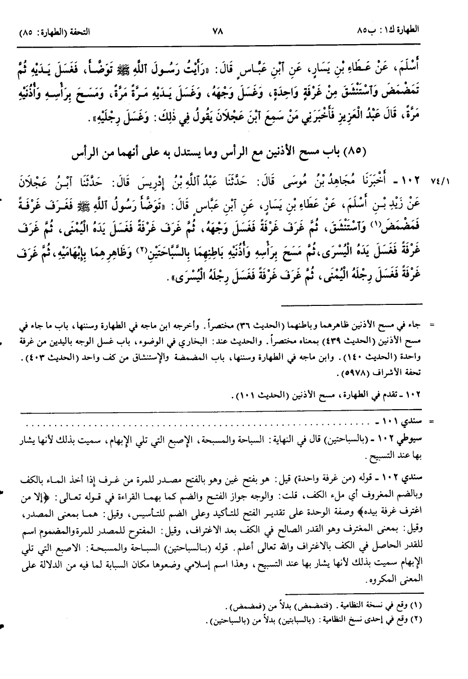بَاب مَسْحِ الْأُذُنَيْنِ مَعَ الرَّأْسِ وَمَا يُسْتَدَلُّ بِهِ عَلَى أَنَّهُمَا مِنْ الرَّأْسِ 102 - أَخْبَرَنَا مُجَاهِدُ بْنُ مُوسَى قَالَ حَدَّثَنَا عَبْدُ اللَّهِ بْنُ إِدْرِيسَ قَالَ حَدَّثَنَا ابْنُ عَجْلَانَ عَنْ زَيْدِ بْنِ أَسْلَمَ عَنْ عَطَاءِ بْنِ يَسَارٍ عَنْ ابْنِ عَبَّاسٍ قَالَ تَوَضَّأَ رَسُولُ اللَّهِ صَلَّى اللَّهُ عَلَيْهِ وَسَلَّمَ فَغَرَفَ غَرْفَةً فَمَضْمَضَ وَاسْتَنْشَقَ ثُمَّ غَرَفَ غَرْفَةً فَغَسَلَ وَجْهَهُ ثُمَّ غَرَفَ غَرْفَةً فَغَسَلَ يَدَهُ الْيُمْنَى ثُمَّ غَرَفَ غَرْفَةً فَغَسَلَ يَدَهُ الْيُسْرَى ثُمَّ مَسَحَ بِرَأْسِهِ وَأُذُنَيْهِ بَاطِنِهِمَا بِالسَّبَّاحَتَيْنِ وَظَاهِرِهِمَا بِإِبْهَامَيْهِ ثُمَّ غَرَفَ غَرْفَةً فَغَسَلَ رِجْلَهُ الْيُمْنَى ثُمَّ غَرَفَ غَرْفَةً فَغَسَلَ رِجْلَهُ الْيُسْرَى