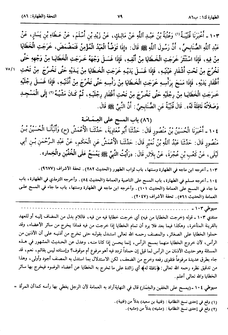 103 - أَخْبَرَنَا قُتَيْبَةُ وَعُتْبَةُ بْنُ عَبْدِ اللَّهِ عَنْ مَالِكٍ عَنْ زَيْدِ بْنِ أَسْلَمَ عَنْ عَطَاءِ بْنِ يَسَارٍ عَنْ عَبْدِ اللَّهِ الصُّنَابِحِيِّ أَنَّ رَسُولَ اللَّهِ صَلَّى اللَّهُ عَلَيْهِ وَسَلَّمَ قَالَ إِذَا تَوَضَّأَ الْعَبْدُ الْمُؤْمِنُ فَتَمَضْمَضَ خَرَجَتْ الْخَطَايَا مِنْ فِيهِ فَإِذَا اسْتَنْثَرَ خَرَجَتْ الْخَطَايَا مِنْ أَنْفِهِ فَإِذَا غَسَلَ وَجْهَهُ خَرَجْتِ الْخَطَايَا مِنْ وَجْهِهِ حَتَّى تَخْرُجَ مِنْ تَحْتِ أَشْفَارِ عَيْنَيْهِ فَإِذَا غَسَلَ يَدَيْهِ خَرَجَتْ الْخَطَايَا مِنْ يَدَيْهِ حَتَّى تَخْرُجَ مِنْ تَحْتِ أَظْفَارِ يَدَيْهِ فَإِذَا مَسَحَ بِرَأْسِهِ خَرَجَتْ الْخَطَايَا مِنْ رَأْسِهِ حَتَّى تَخْرُجَ مِنْ أُذُنَيْهِ فَإِذَا غَسَلَ رِجْلَيْهِ خَرَجَتْ الْخَطَايَا مِنْ رِجْلَيْهِ حَتَّى تَخْرُجَ مِنْ تَحْتِ أَظْفَارِ رِجْلَيْهِ ثُمَّ كَانَ مَشْيُهُ إِلَى الْمَسْجِدِ وَصَلَاتُهُ نَافِلَةً لَهُ قَالَ قُتَيْبَةُ عَنْ الصُّنَابِحِيِّ أَنَّ النَّبِيَّ صَلَّى اللَّهُ عَلَيْهِ وَسَلَّمَ قَالَ