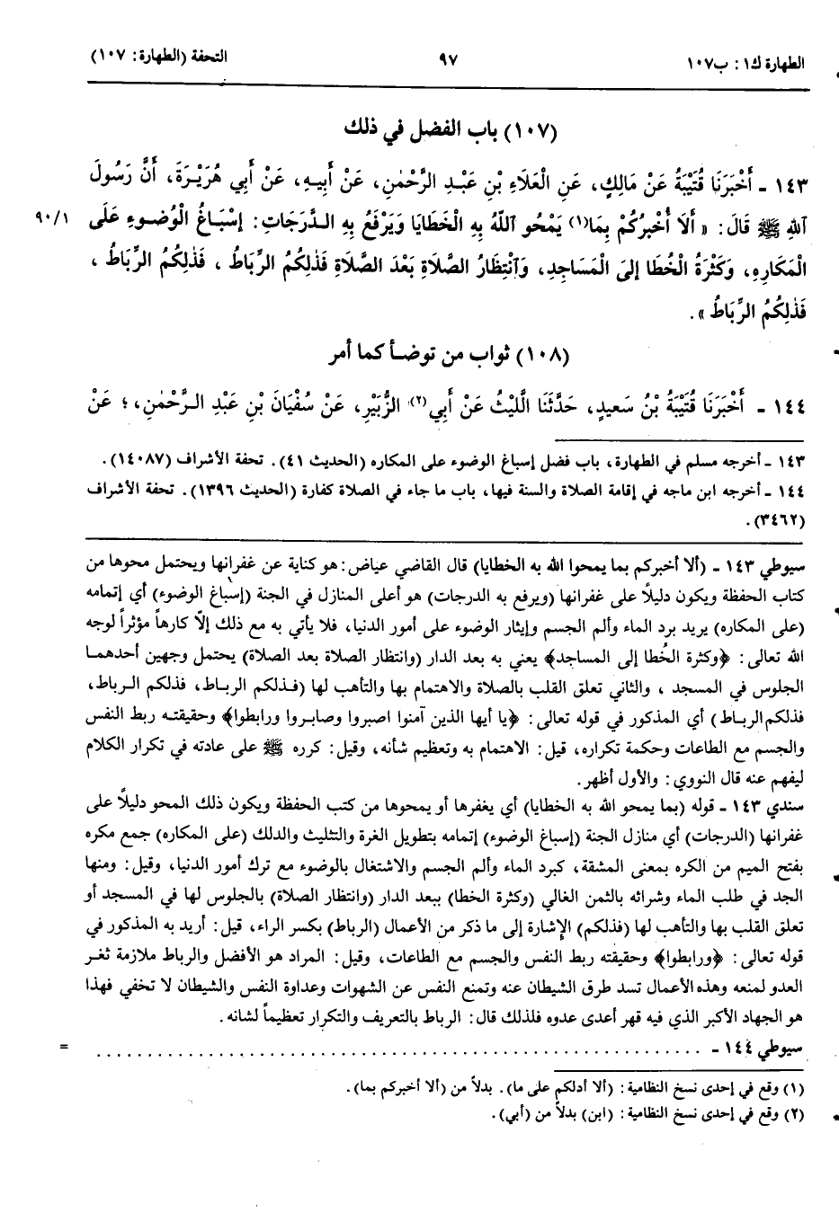 بَاب الْفَضْلِ فِي ذَلِكَ 143 - أَخْبَرَنَا قُتَيْبَةُ عَنْ مَالِكٍ عَنْ الْعَلَاءِ بْنِ عَبْدِ الرَّحْمَنِ عَنْ أَبِيهِ عَنْ أَبِي هُرَيْرَةَ أَنَّ رَسُولَ اللَّهِ صَلَّى اللَّهُ عَلَيْهِ وَسَلَّمَ قَالَ أَلَا أُخْبِرُكُمْ بِمَا يَمْحُو اللَّهُ بِهِ الْخَطَايَا وَيَرْفَعُ بِهِ الدَّرَجَاتِ إِسْبَاغُ الْوُضُوءِ عَلَى الْمَكَارِهِ وَكَثْرَةُ الْخُطَا إِلَى الْمَسَاجِدِ وَانْتِظَارُ الصَّلَاةِ بَعْدَ الصَّلَاةِ فَذَلِكُمْ الرِّبَاطُ فَذَلِكُمْ الرِّبَاطُ فَذَلِكُمْ الرِّبَاطُ