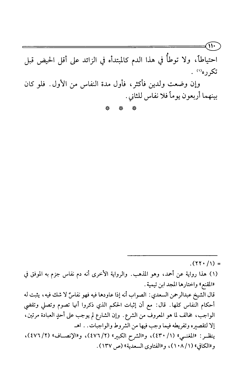 قال الشيخ عبد الرحمن السعدي: الصواب أنه إذا عاودها فيه فهو نفاسٌ لا شك فيه، يثبت له أحكام النفاس كلها. قال: مع أن إثبات الحكم الذي ذكروا أنها تصوم وتصلي وتقضي الواجب، مخالف لما هو المعروف من الشرع. وإن الشارع لم يوجب على أحدٍ العبادة مرتين، إِلا لمصيره وتفريطه فيما وجب فيها الشروط والواجبات. . اهـ