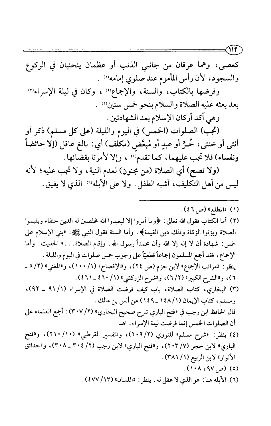 (تجب) الصلوات (الخمس) وفي اليوم والليلة (على كل مسلم) ذكر أو أنثى أو خنثى، حُرٍّ أو عبدٍ أو مُبعَّضٍ (مكلف) أي: بالغ عاقل (إِلا حائضًا ونفساء) فلا تجب عليهما، كما تقدم (¬5)، وإلا لأمرتا بقضائها.