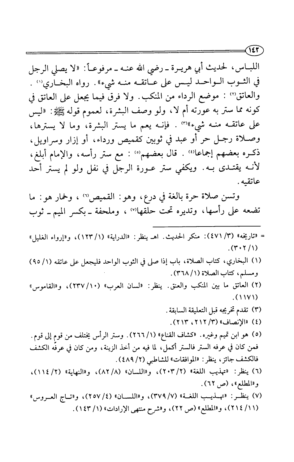 (¬1) البخاري، كتاب الصلاة، باب إذا صلى في الثوب الواحد فليجعل على عاتقه (1/ 95) ومسلم، كتاب الصلاة (1/ 368).