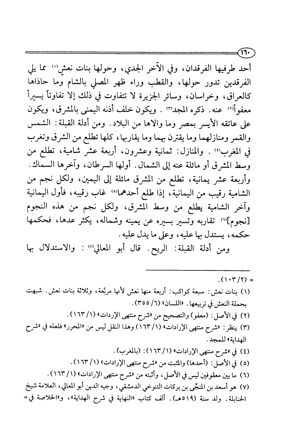 أحد طرفيها الفرقدان، وفي الآخر الجدي، وحولها بنات نعشٍ (¬1) مما يلي الفرقدين تدور حولها، والقطب وراء ظهر المصلي بالشام وما حاذاها كالعراق، وخراسان، وسائر الجزيرة لا تتفاوت في ذلك إلا تفاوتًا يسيرًا معفوًا (¬2) عنه. ذكره الجد (¬3). ويكون خلف أذنه اليمنى بالمشرق، ويكون على عاتقه الأيسر بمصر وما والاها من البلاد. ومن أدلة القبلة: الشمس والقمر ومنازلهما وما يقترن بهما وما يقاربها، كلها تطلع من الشرق وتغرب في المغرب (¬4). والمنازل: ثمانية وعشرون، أربعة عشر شامية، تطلع من وسط المشرق أو مائلة عنه إلى الشمال. أولها السرطان، وآخرها السماك. وأربعة عشر يمانية، تطلع من المشرق مائلة إلى اليمين، ولكل نجم من الشامية رقيب من اليمانية، إذا طلع أحدهما (¬5) غاب رقيبه، فأول اليمانية وآخر الشامية يطلع من وسط المشرق، ولكل نجم من هذه النجوم [نجوم] (¬6) تقاربه وتسير بسيره عن يمينه وشماله، يكثر عدها، فحكمها حكمه، يستدل بها عليه، وعلى ما يدل عليه.