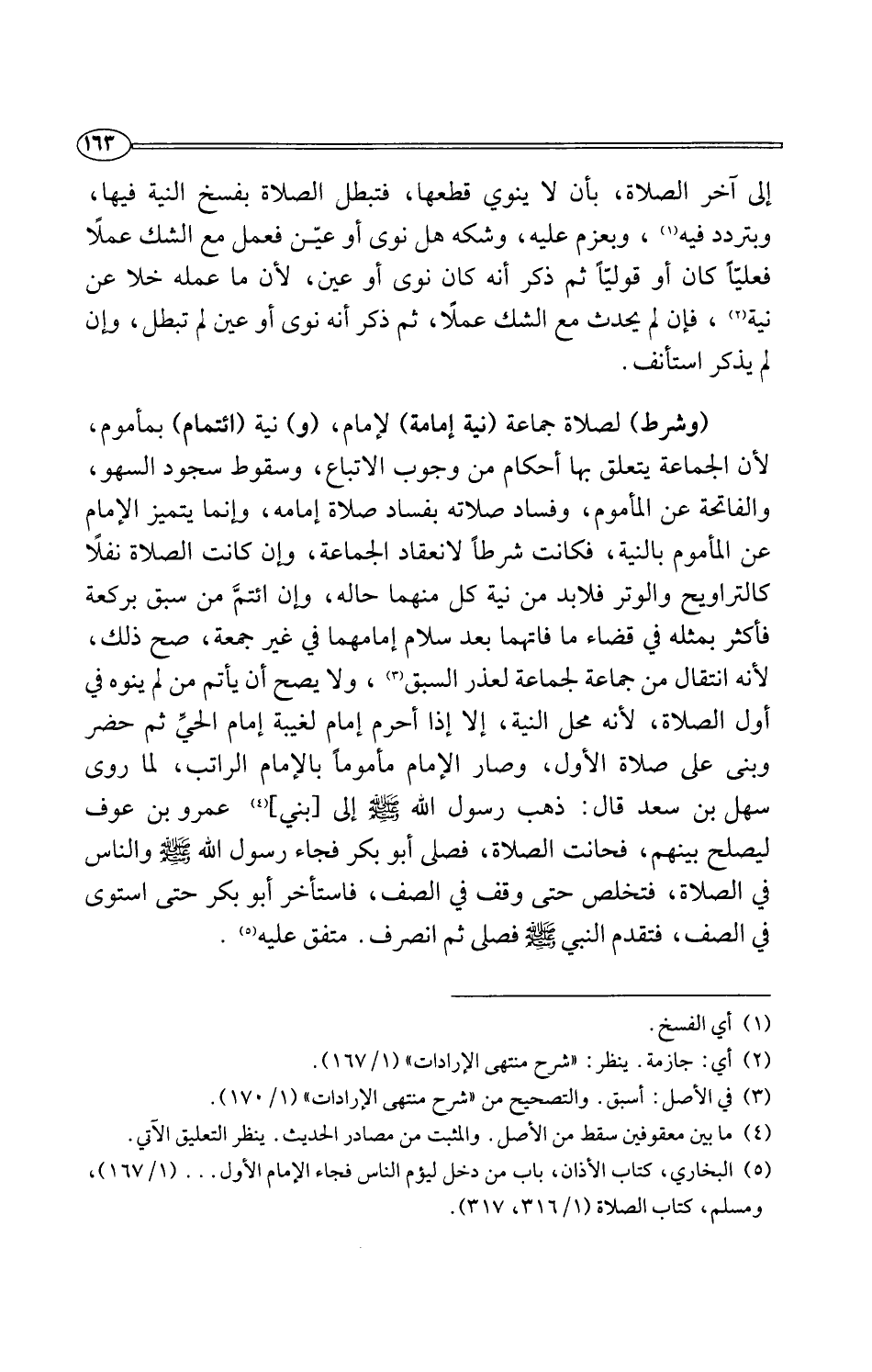 (وشرط) لصلاة جماعة (نية إمامة) لإمام، (و) نية (ائتمام) بمأموم، لأن الجماعة يتعلق بها أحكام من وجوب الاتباع، وسقوط سجود السهو، والفاتحة عن المأموم، وفساد صلاته بفساد صلاة إمامه، وإنما يتميز الإمام عن المأموم بالنية، فكانت شرطًا لانعقاد الجماعة، وإن كانت الصلاة نفلًا كالتراويح والوتر فلابد من نية كل منهما حاله، وإن ائتمَّ من سبق بركعة فأكثر بمثله في قضاء ما فاتهما بعد سلام إمامهما في غير جمعة، صح ذلك، لأنه انتقال من جماعة لجماعة لعذر السبق (¬3)، ولا يصح أن يأتم من لم ينوه في أول الصلاة، لأنه محل النية، إلا إذا أحرم إمام لغيبة إمام الحيِّ ثم حضر وبنى على صلاة الأول، وصار الإمام مأمومًا بالإمام الراتب، لما روى سهل بن سعد قال: ذهب رسول اللَّه -صلى اللَّه عليه وسلم- إلى [بني] (¬4) عمرو بن عوف ليصلح بينهم، فحانت الصلاة، فصلى أبو بكر فجاء رسول اللَّه -صلى اللَّه عليه وسلم- والناس في الصلاة، فتخلص حتى وقف في الصف، فاستأخر أبو بكر حتى استوى في الصف، فتقدم النبي -صلى اللَّه عليه وسلم- فصلى ثم انصرف. متفق عليه (¬5).