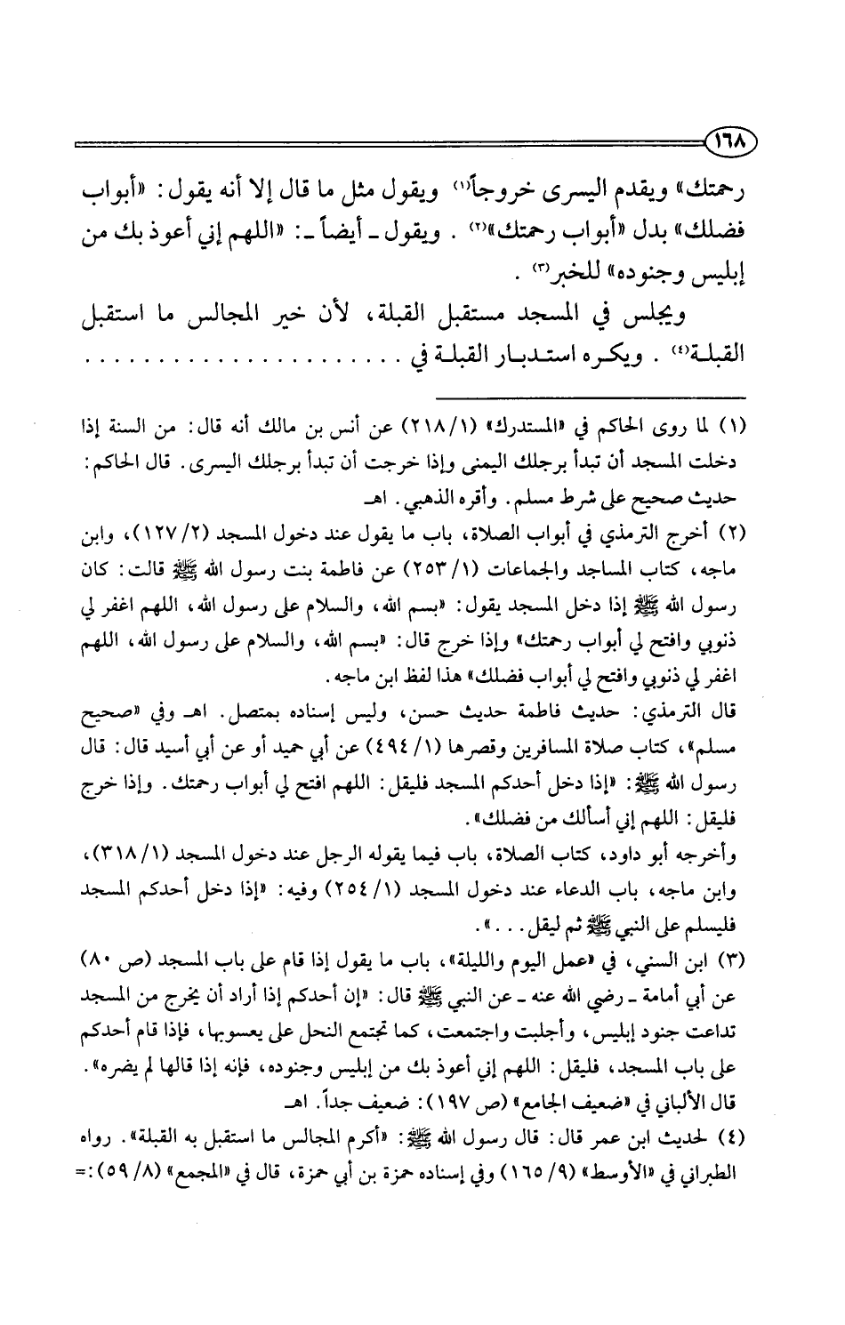 (¬4) لحديث ابن عمر قال: قال رسول اللَّه -صلى اللَّه عليه وسلم-: "أكرم المجالس استقبل به القبلة". رواه الطبراني في "الأوسط" (9/ 165) وفي إسناده حمزة بن أبي حمزة، قال في "المجمع" (8/ 59): =