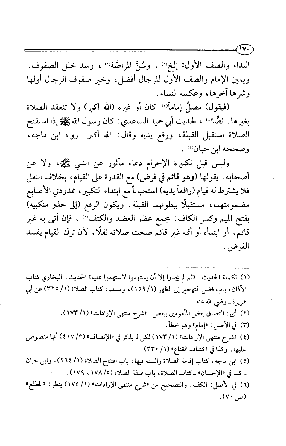 وليس قبل تكبيرة الإحرام دعاء مأثور عن النبي -صلى اللَّه عليه وسلم-، ولا عن أصحابه. يقولها (وهو قائم في فرض) مع القدرة على القيام، بخلاف النفل فلا يشترط له قيام (رافعًا يديه) استحبابًا مع ابتداء التكبير، ممدودتي الأصابع مضمومتهما، مستقبلًا ببطونهما القبلة. ويكون الرفع (إلى حذو منكبيه) بفتح الميم وكسر الكاف: مجمع عظم العضد والكتف (¬6)، فإن أتى به غير قائم، أو ابتدأه أو أتمه غير قائم صحت صلاته نفلًا، لأن ترك القيام يفسد الفرض.