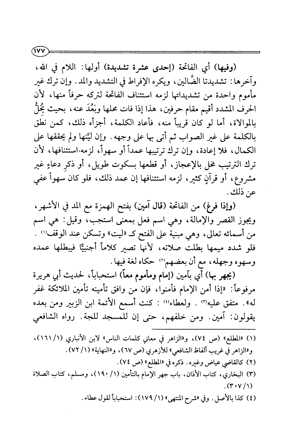 (وفيها) أي الفاتحة (إحدى عشرة تشديدة) أولها: اللام في اللَّه، وآخرها: تشديدتا الضَّالين، ويكره الإفراط في التشديد والمد. وإن ترك غير مأموم واحدة من تشديداتها لزمه استئناف الفاتحة لتركه حرفًا منها، لأن الحرف المشدد أقيم مقام حرفين، هذا إذا فات محلها وبَعُدَ عنه، بحيث يُخِلُّ بالموالاة، أما لو كان قريبًا منه، فأعاد الكلمة، أجزأه ذلك، كمن نطق بالكلمة على غير الصواب ثم أتى بها على وجهه. وإن ليَّنها ولم يحققها على الكمال، فلا إعادة، وإن ترك ترتيبها عمدًا أو سهوًا، لزمه استئنافها، لأن ترك الترتيب مخل بالإعجاز، أو قطعها بسكوت طويل، أو ذكرِ دعاءٍ غير مشروع، أو قرآنٍ كثير، لزمه استئنافها إن عمد ذلك، فلو كان سهوًا عفي عن ذلك.