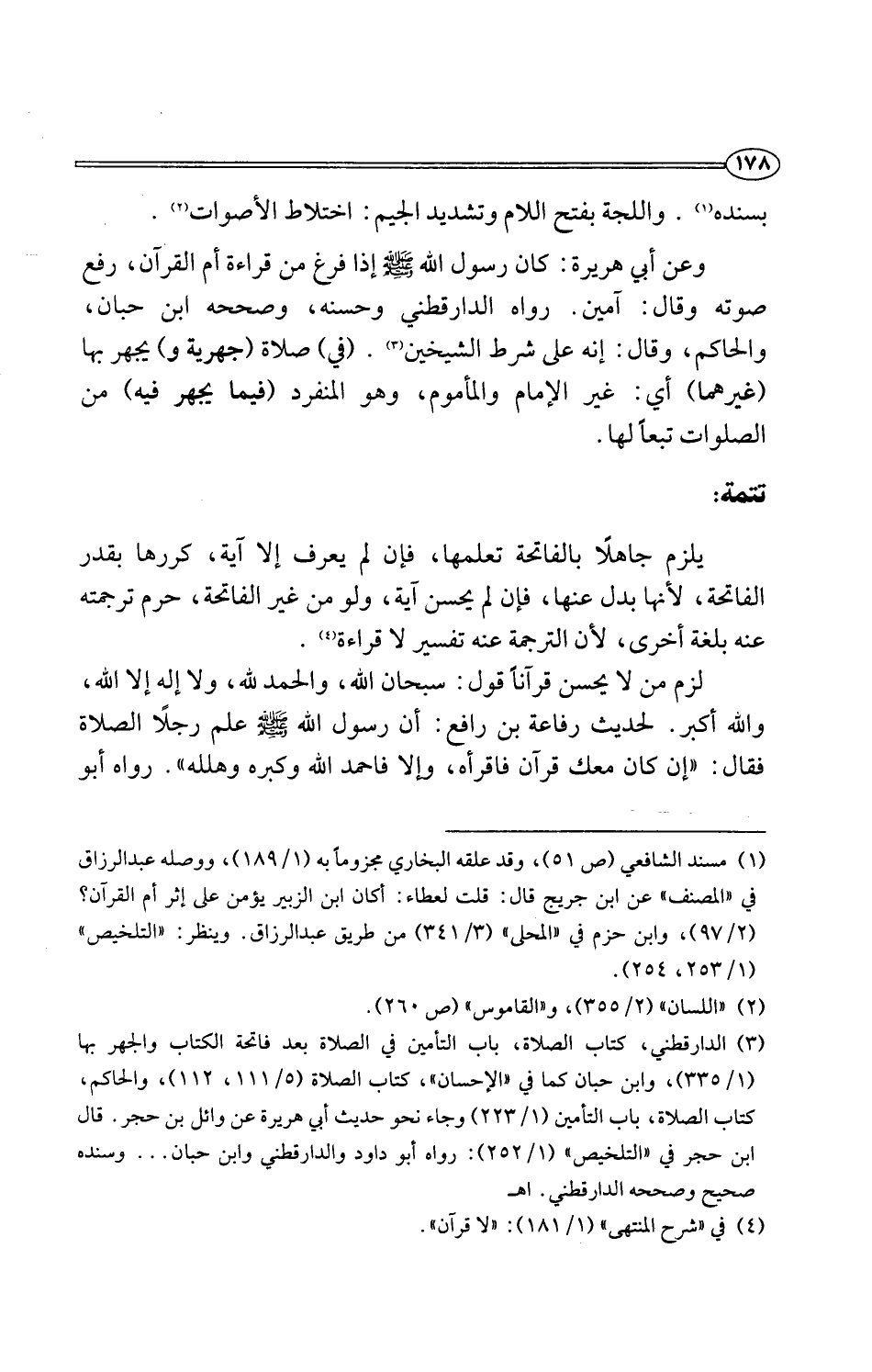 (¬3) الدارقطني، كتاب الصلاة، باب التأمين في الصلاة بعد فاتحة الكتاب والجهر بها (1/ 335)، وابن حبان كما في "الإحسان"، كتاب الصلاة (5/ 111، 112)، والحاكم، كتاب الصلاة، باب التأمين (1/ 223) وجاء نحو حديث أبي هريرة عن وائل بن حجر. قال ابن حجر في "التلخيص" (1/ 252): رواه أبو داود والدارقطني وابن حبان. . . وسنده صحيح وصححه الدارقطني. اهـ
