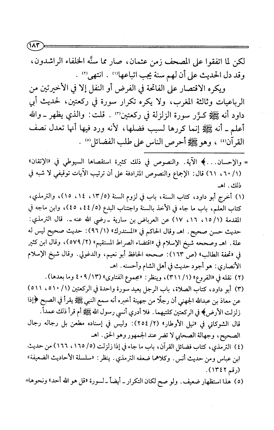 ويكره الاقتصار على الفاتحة في الفرض أو النفل إلا في الأخيرتين من الرباعيات وثالثة المغرب، ولا يكره تكرار سورة في ركعتين، لحديث أبي داود أنه -صلى اللَّه عليه وسلم- كرَّر سورة الزلزلة في ركعتين (¬3). قلت: والذي يظهر -واللَّه أعلم- أنه -صلى اللَّه عليه وسلم- إنما كررها لسبب فضلها، لأنه ورد فيها أنها تعدل نصف القرآن (¬4)، وهو -صلى اللَّه عليه وسلم- أحرص الناس على طلب الفضائل (¬5).