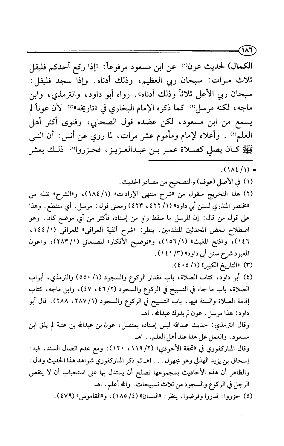 (¬4) أبو داود، كتاب الصلاة، باب مقدار الركوع والسجود (1/ 550) والترمذي، أبواب الصلاة، باب ما جاء في التسبيح في الركوع والسجود (2/ 46، 47)، وابن ماجه، كتاب إقامة الصلاة والسنة فيها، باب التسبيح في الركوع والسجود (1/ 287، 288). قال أبو داود: هذا مرسل. عون لم يدرك عبد اللَّه. اهـ