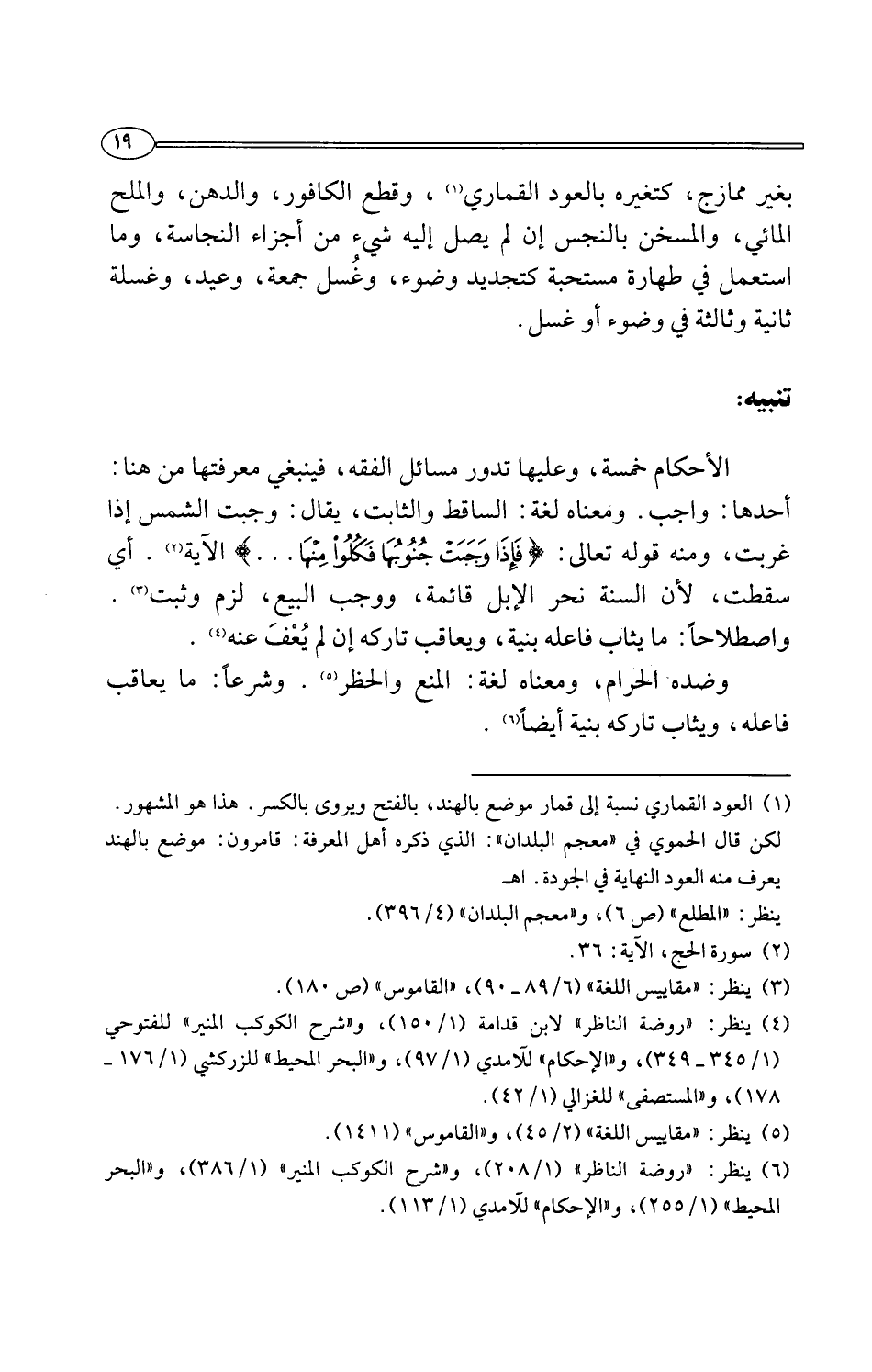 الأحكام خمسة، وعليها تدور مسائل الفقه، فينبغي معرفتها من هنا: أحدها: واجب. ومعناه لغة: الساقط والثابت، يقال: وجبت الشمس إذا غربت، ومنه قوله تعالى: {فَإِذَا وَجَبَتْ جُنُوبُهَا فَكُلُوا مِنْهَا. . .} الآية (¬2). أي سقطت، لأن السنة نحر الإبل قائمة، ووجب البيع، لزم وثبت (¬3). واصطلاحًا: ما يثاب فاعله بنية، ويعاقب تاركه إن لم يُعْفَ عنه (¬4).