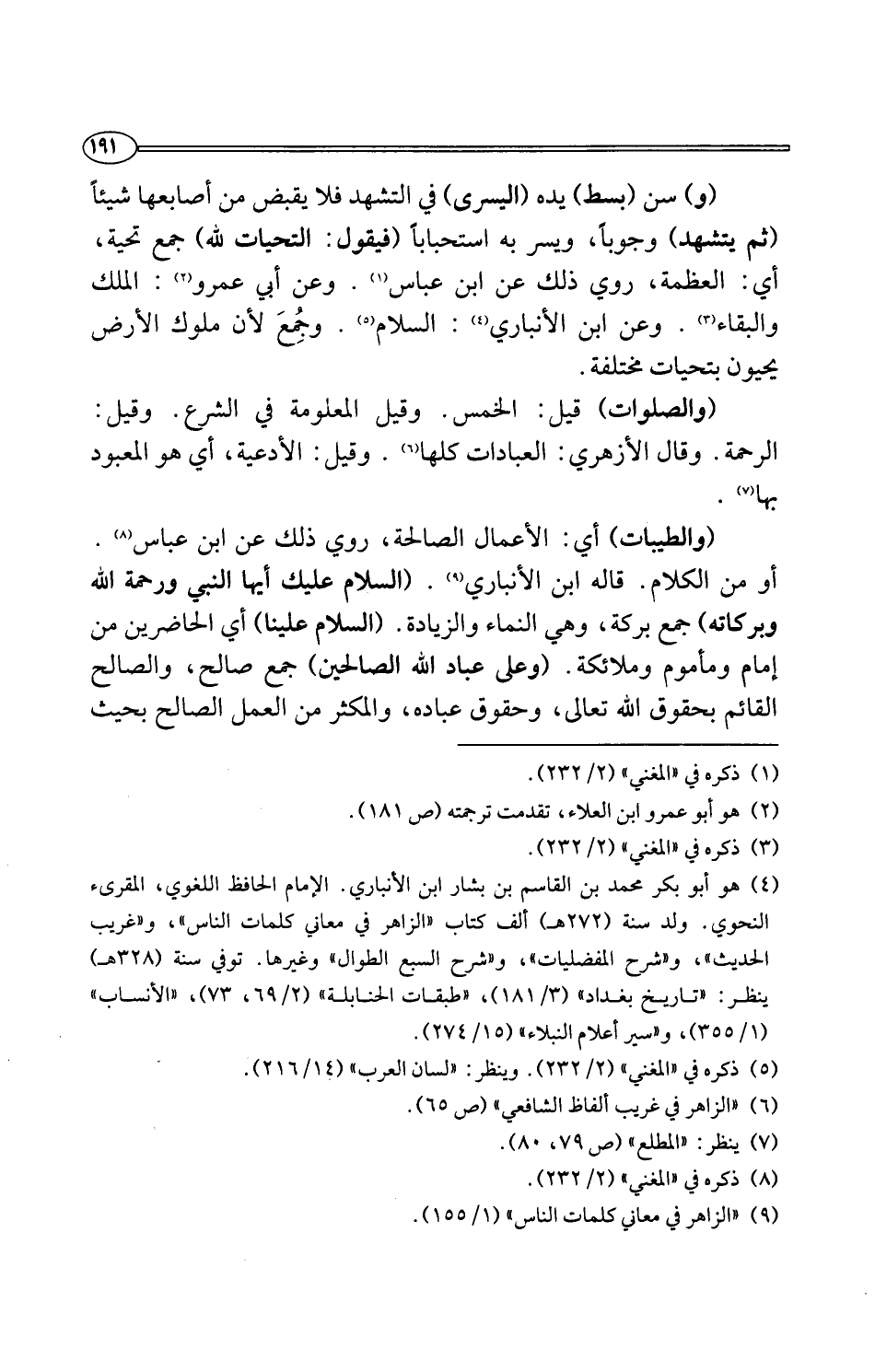 (والطيبات) أي: الأعمال الصالحة، روي ذلك عن ابن عباس (¬8). أو من الكلام. قاله ابن الأنباري (¬9). (السلام عليك أيها النبي ورحمة اللَّه وبركاته) جمع بركة، وهي النماء والزيادة. (السلام علينا) أي الحاضرين من إمام ومأموم وملائكة. (وعلى عباد اللَّه الصالحين) جمع صالح، والصالح القائم بحقوق اللَّه تعالى، وحقوق عباده، والمكثر من العمل الصالح بحيث