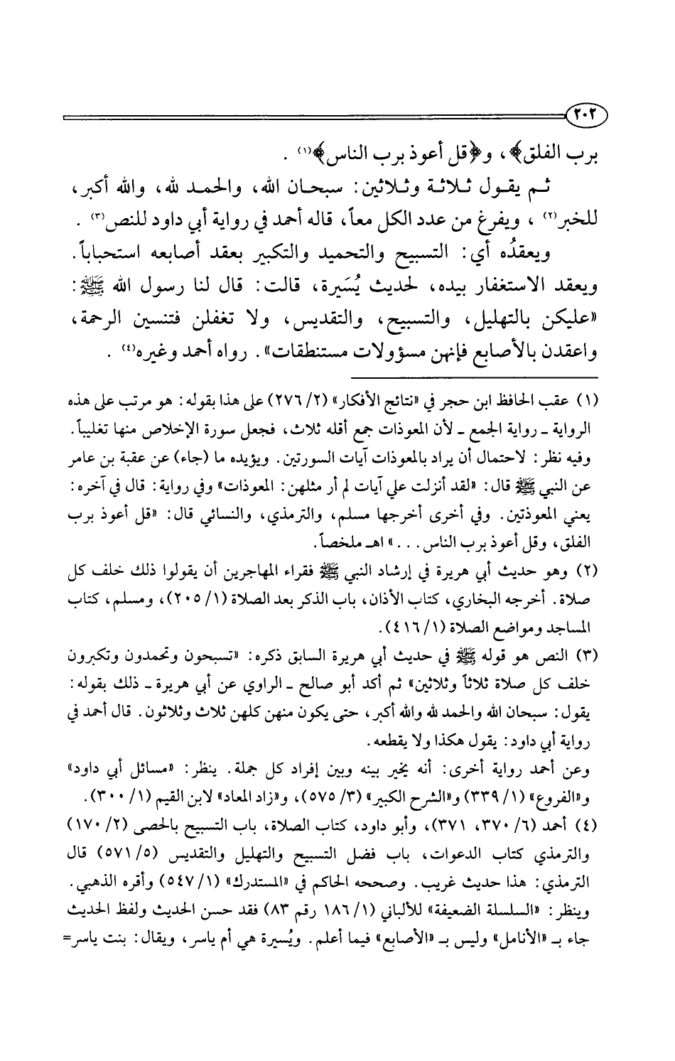 (¬3) النص هو قوله -صلى اللَّه عليه وسلم- في حديث أبي هريرة السابق ذكره: "تسبحون وتحمدون وتكبرون خلف كل صلاة ثلاثًا وثلاثين" ثم أكد أبو صالح -الراوي عن أبي هريرة- ذلك بقوله: يقول: سبحان اللَّه والحمد للَّه واللَّه أكبر، حتى يكون منهن كلهن ثلاث وثلاثون. قال أحمد في رواية أبي داود: يقول هكذا ولا يقطعه.