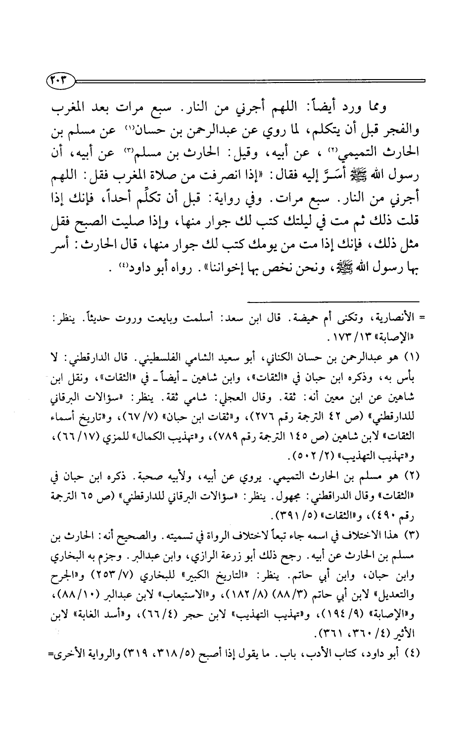 ومما ورد أيضًا: اللهم أجرني من النار. سبع مرات بعد المغرب والفجر قبل أن يتكلم، لما روي عن عبد الرحمن بن حسان (¬1) عن مسلم بن الحارث التميمي (¬2)، عن أبيه، وقيل: الحارث بن مسلم (¬3) عن أبيه، أن رسول اللَّه -صلى اللَّه عليه وسلم- أسَرَّ إليه فقال: "إذا انصرفت من صلاة المغرب فقل: اللهم أجرني من النار. سبع مرات. وفي رواية: قبل أن تكلِّم أحدًا، فإنك إذا قلت ذلك ثم مت في ليلتك كتب لك جوار منها، وإذا صليت الصبح فقل مثل ذلك، فإنك إذا مت من يومك كتب لك جوار منها، قال الحارث: أسر بها رسول اللَّه -صلى اللَّه عليه وسلم-، ونحن نخص بها إخواننا". رواه أبو داود (¬4).