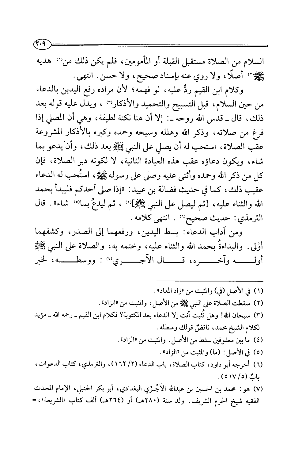 وكلام ابن القيم ردٌّ عليه، لو فهمه؛ لأن مراده رفع اليدين بالدعاء من حين السلام، قبل التسبيح والتحميد والأذكار (¬3)، ويدل عليه قوله بعد ذلك، قال -قدس اللَّه روحه-: إلا أن هنا نكتة لطيفة، وهي أن المصلي إذا فرغ من صلاته، وذكر اللَّه وهلله وسبحه وحمده وكبره بالأذكار المشروعة عقب الصلاة، استحب له أن يصلي على النبي -صلى اللَّه عليه وسلم- بعد ذلك، وأن يدعو بما شاء، ويكون دعاؤه عقب هذه العبادة الثانية، لا لكونه دبر الصلاة، فإن كل من ذكر اللَّه وحمده وأثنى عليه وصلى على رسوله -صلى اللَّه عليه وسلم-، استُحب له الدعاء عقيب ذلك، كما في حديث فضالة بن عبيد: "إذا صلى أحدكم فليبدأ بحمد اللَّه والثناء عليه، [ثم ليصل على النبي -صلى اللَّه عليه وسلم-] (¬4)، ثم ليدعُ بما (¬5) شاء". قال الترمذي: حديث صحيح (¬6). انتهى كلامه.