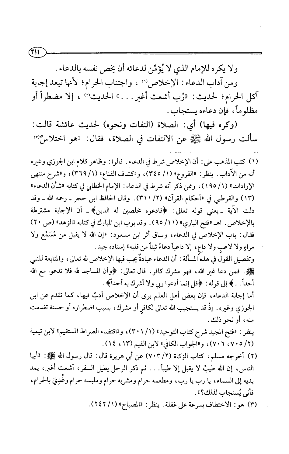 ومن آداب الدعاء: الإخلاص (¬1)، واجتناب الحرام؛ لأنها تبعد إجابة آكل الحرام؛ لحديث: "رُب أشعث أغبر. . . " الحديث (¬2)، إلا مضطرًا أو مظلومًا، فإن دعاءه يستجاب.