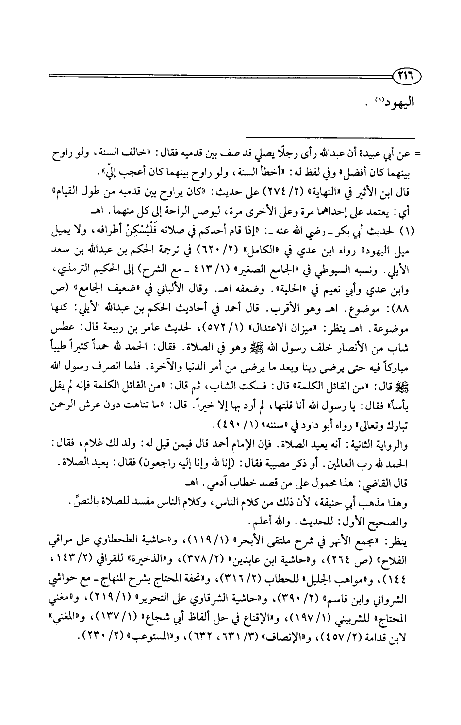 (¬1) لحديث أبي بكر -رضي اللَّه عنه-: "إذا قام أحدكم في صلاته فَلْيُسْكِنْ أطرافه، ولا يميل ميل اليهود" رواه ابن عدي في "الكامل" (2/ 620) في ترجمة الحكم بن عبد اللَّه بن سعد الأيلي. ونسبه السيوطي في "الجامع الصغير" (1/ 413 - مع الشرح) إلى الحكيم الترمذي، وابن عدي وأبي نعيم في "الحلية". وضعفه اهـ. وقال الألباني في "ضعيف الجامع" (ص 88): موضوع. اهـ وهو الأقرب. قال أحمد في أحاديث الحكم بن عبد اللَّه الأيلي: كلها موضوعة. اهـ ينظر: "ميزان الاعتدال" (1/ 572)، لحديث عامر بن ربيعة قال: عطس شاب من الأنصار خلف رسول اللَّه -صلى اللَّه عليه وسلم- وهو في الصلاة. فقال: الحمد للَّه حمدًا كثيرًا طيبًا مباركًا فيه حتى يرضى ربنا وبعد ما يرضى من أمر الدنيا والآخرة. فلما انصرف رسول اللَّه -صلى اللَّه عليه وسلم- قال: "من القائل الكلمة" قال: فسكت الشاب، ثم قال: "من القائل الكلمة فإنه لم يقل بأسًا" فقال: يا رسول اللَّه أنا قلتها، لم أرد بها إلا خيرًا. قال: "ما تناهت دون عرش الرحمن تبارك وتعالى" رواه أبو داود في "سننه" (1/ 490).