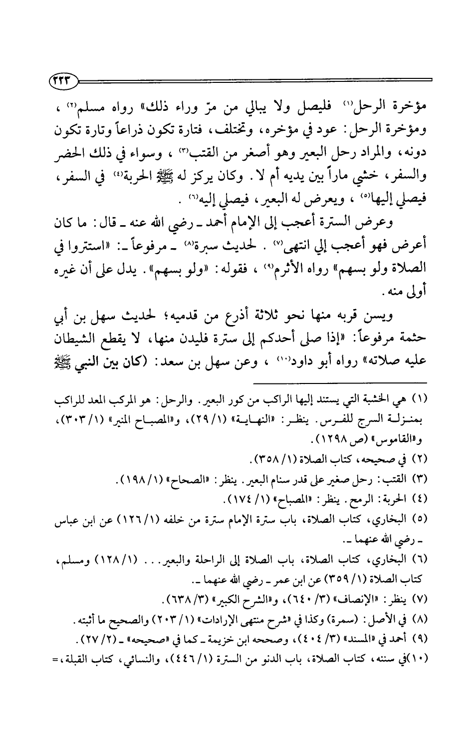 مؤخرة الرحل (¬1) فليصل ولا يبالي من مرّ وراء ذلك" رواه مسلم (¬2)، ومؤخرة الرحل: عود في مؤخره، وتختلف، فتارة تكون ذراعًا وتارة تكون دونه، والمراد رحل البعير وهو أصغر من القتب (¬3)، وسواء في ذلك الحضر والسفر، خشي مارًا بين يديه أم ألا. وكان يركز له -صلى اللَّه عليه وسلم- الحربة (¬4) في السفر، فيصلي إليها (¬5)، ويعرض له البعير، فيصلي إليه (¬6).