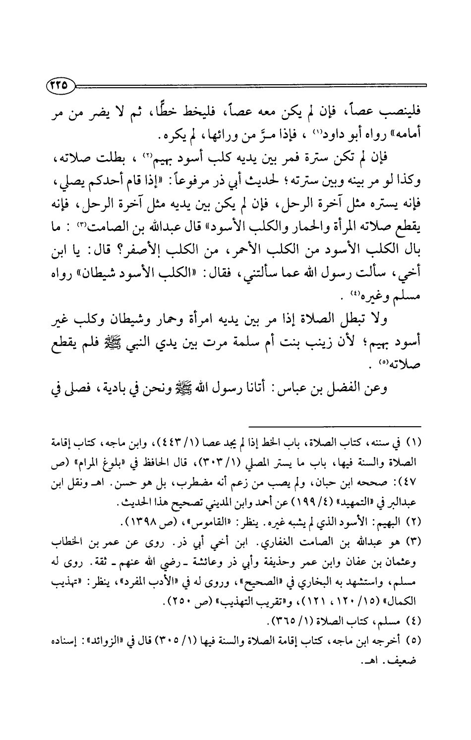ولا تبطل الصلاة إذا مر بين يديه امرأة وحمار وشيطان وكلب غير أسود بهيم؛ لأن زينب بنت أم سلمة مرت بين يدي النبي -صلى اللَّه عليه وسلم- فلم يقطع صلاته (¬5).