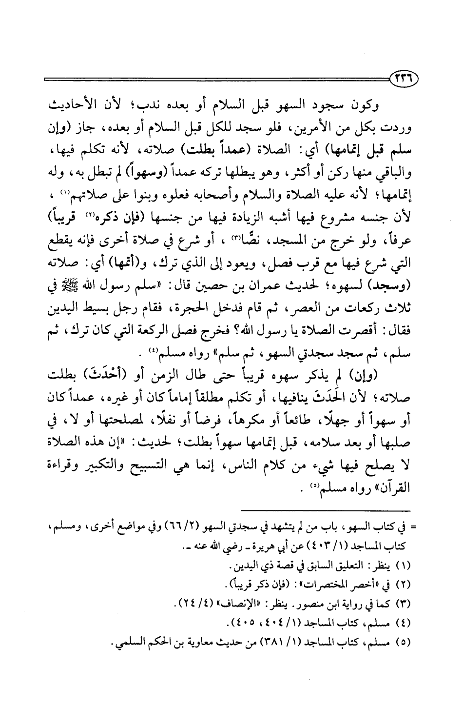 (وإن) لم يذكر سهوه قريبًا حتى طال الزمن أو (أحْدَثَ) بطلت صلاته، لأن الحَدَثَ ينافيها، أو تكلم مطلقًا إمامًا كان أو غيره، عمدًا كان أو سهوًا أو جهلًا، طائعًا أو مكرهًا، فرضًا أو نفلًا، لمصلحتها أو لا، في صلبها أو بعد سلامه، قبل إتمامها سهوًا بطلت؛ لحديث: "إن هذه الصلاة لا يصلح فيها شيء من كلام الناس، إنما هي التسبيح والتكبير وقراءة القرآن" رواه مسلم (¬5).