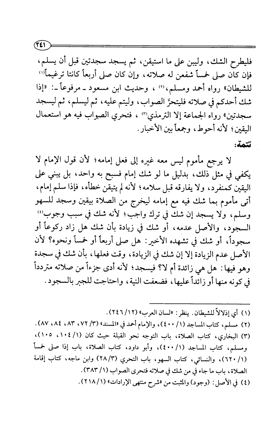 لا يرجع مأموم ليس معه غيره إلى فعل إمامه؛ لأن قول الإمام لا يكفي في مثل ذلك، بدليل ما لو شك إمام فسبح به واحد، بل يبني على اليقين كمنفرد، ولا يفارقه قبل سلامه؛ لأنه لم يتيقن خطأه، فإذا سلم إمام، أتى مأموم بما شك فيه مع إمامه ليخرج من الصلاة بيقين وسجد للسهو وسلم، ولا يسجد إن شك في ترك واجب؛ لأنه شك في سبب وجوب (¬4) السجود، والأصل عدمه، أو شك في زيادة بأن شك هل زاد ركوعًا أو سجودًا، أو شك في تشهده الأخير: هل صلى أربعًا أو خمسًا ونحوه؟ لأن الأصل عدم الزيادة إلا إن شك في الزيادة، وقت فعلها، بأن شك في سجدة وهو فيها: هل هي زائدة أم لا؟ فيسجد؛ لأنه أدى جزءًا من صلاته مترددًا في كونه منها أو زائدًا عليها، فضعفت النية، واحتاجت للجبر بالسجود.