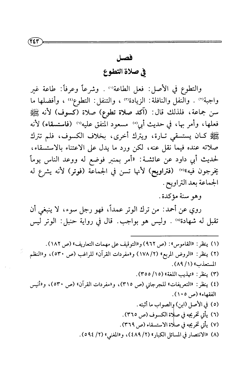والتطوع في الأصل: فعل الطاعة (¬1). وشرعًا وعرفًا: طاعة غير واجبة (¬2). والنفل والنافلة: الزيادة (¬3)، والتنفل: التطوع (¬4)، وأفضلها ما سن جماعة، فلذلك قال: (آكد صلاة تطوع) صلاة (كسوف) لأنه -صلى اللَّه عليه وسلم- فعلها، وأمر بها، في حديث أبي (¬5) مسعود المتفق عليه (¬6) (فاستسقاء) لأنه -صلى اللَّه عليه وسلم- كان يستسقي تارة، ويترك أخرى، بخلاف الكسوف، فلم تترك صلاته عنده فيما نقل عنه، لكن ورد ما يدل على الاعتناء بالاستسقاء، حديث أبي داود عن عائشة: "أمر بمنبر فوضع له ووعد الناس يومًا يخرجون فيه" (¬7) (فتراويح) لأنها تسن في الجماعة (فوتر) لأنه يشرع له الجماعة بعد التراويح.