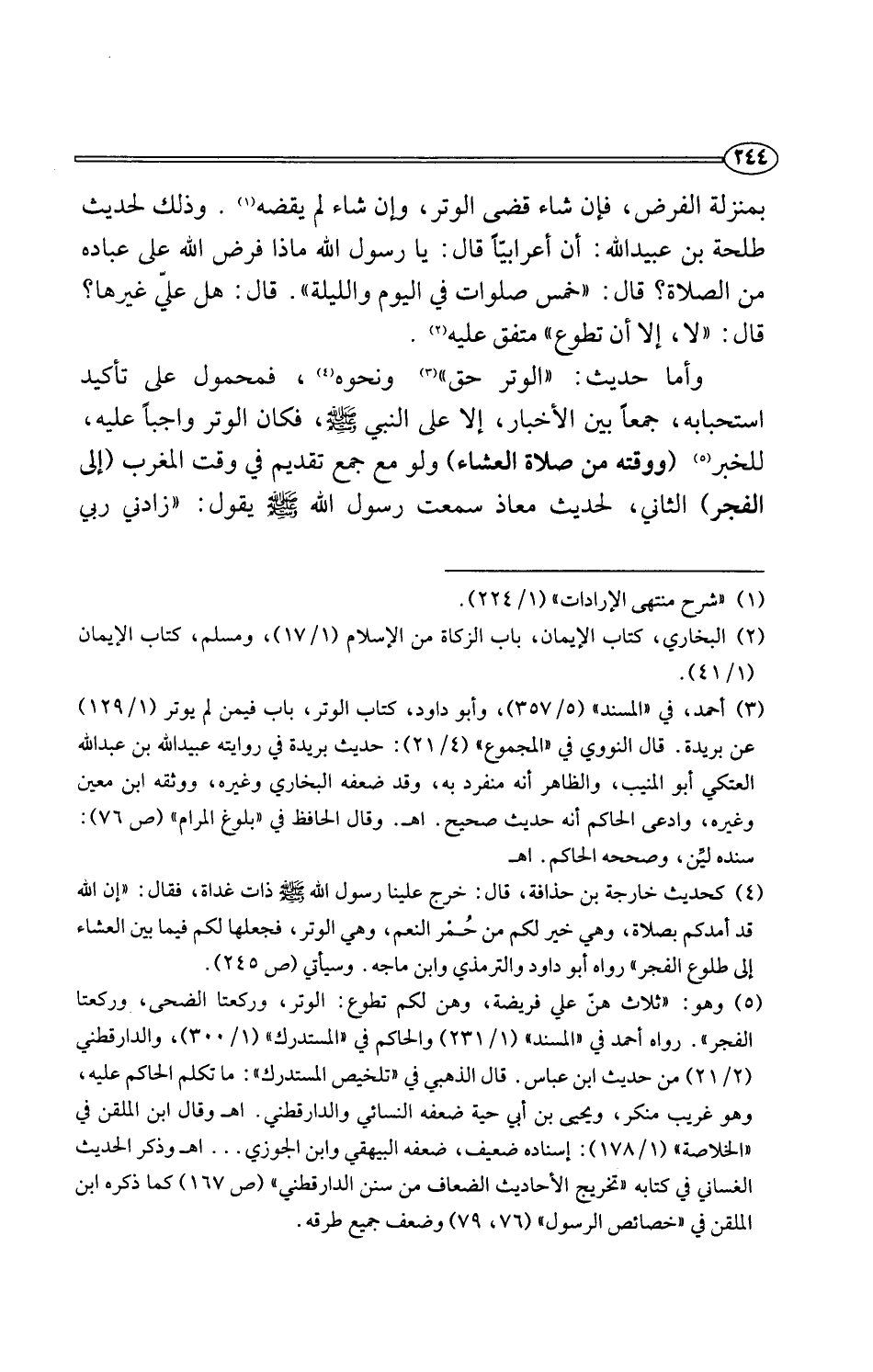 (¬4) كحديث خارجة بن حذافة، قال: خرج علينا رسول اللَّه -صلى اللَّه عليه وسلم- ذات غداة، فقال: "إن اللَّه قد أمدكم بصلاة، وهي خير لكم من حُمْر النعم، وهي الوتر، فجعلها لكم فيما بين العشاء إلى طلوع الفجر" رواه أبو داود والزمذي وابن ماجه. وسيأتي (ص 245).