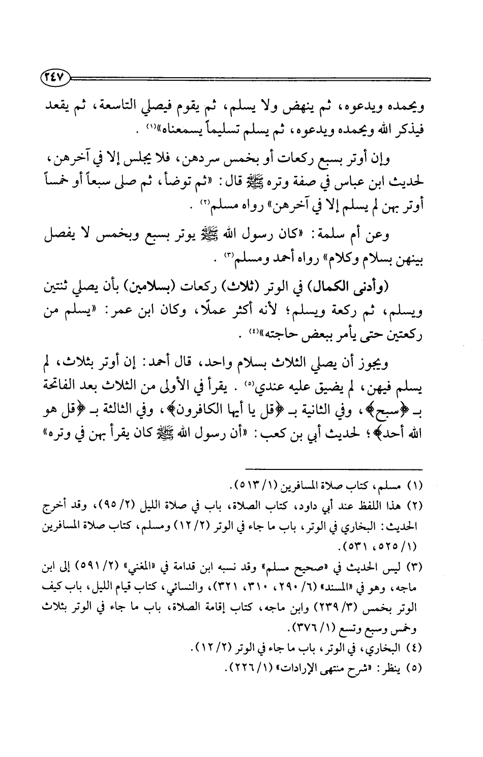 وعن أم سلمة: "كان رسول اللَّه -صلى اللَّه عليه وسلم- يوتر بسبع وبخمس لا يفصل بينهن بسلام وكلام" رواه أحمد ومسلم (¬3).