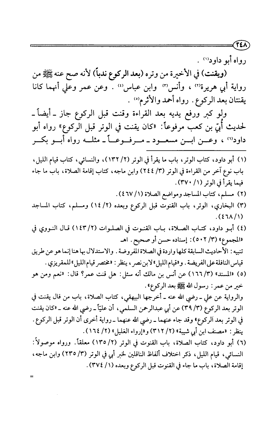(¬6) أبو داود، كتاب الصلاة، باب القنوت في الوتر (2/ 135) معلقًا. ورواه موصولًا: النسائي، قيام الليل، ذكر اختلاف ألفاظ الناقلين لخبر أبي في الوتر (3/ 235) وابن ماجه، إقامة الصلاة، باب ما جاء في القنوت قبل الركوع وبعده (1/ 374). =