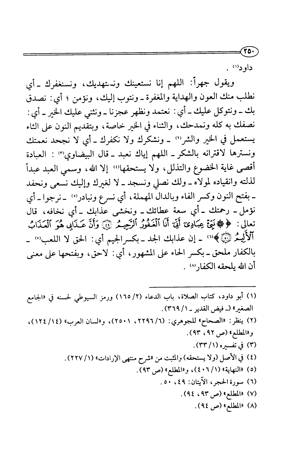 ويقول جهرًا: اللهم إنا نستعينك ونسهديك، ونستغفرك -أي نطلب منك العون والهداية والمغفرة- ونتوب إليك، ونؤمن؛ أي: نصدق بك- ونتوكل عليك -أي: نعتمد ونظهر عجزنا- ونثني عليك الخير -أي: نصفك به كله ونمدحك، والثناء في الخير خاصة، وبتقديم النون على الثاء يستعمل في الخير والشر (¬2) - ونشكرك ولا نكفرك -أي لا نجحد نعمتك ونسترها لاقترانه بالشكر- اللهم إياك نعبد -قال البيضاوي (¬3): العبادة أقصى غاية الخضوع والتذلل، ولا يستحقها (¬4) إلا اللَّه، وسمي العبد عبدًا لذلته وانقياده لمولاه- ولك نصلي ونسجد -لا لغيرك وإليك نسعى ونحفد -بفتح النون وكسر الفاء وبالدال المهملة، أي نسرع ونبادر (¬5) - نرجوا -أي نؤمل- رحمتك -أي سعة عطائك- ونخشى عذابك -أي نخافه، قال تعالى: {نَبِّئْ عِبَادِي أَنِّي أَنَا الْغَفُورُ الرَّحِيمُ (49) وَأَنَّ عَذَابِي هُوَ الْعَذَابُ الْأَلِيمُ (50)} (¬6) - إن عذابك الجد -بكسر الجيم أي: الحق لا اللعب (¬7) - بالكفار ملحق -بكسر الحاء على المشهور، أي: لاحق، وبفتحها على معنى أن اللَّه يلحقه الكفار (¬8).