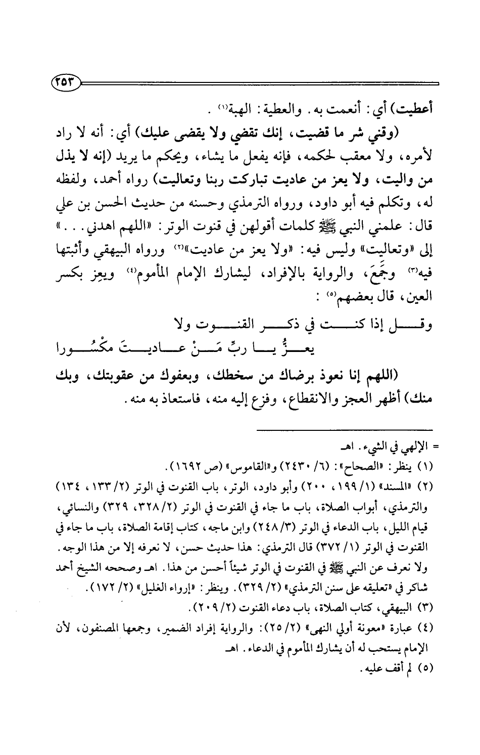(¬2) "المسند" (1/ 199، 200) وأبو داود، الوتر، باب القنوت في الوتر (2/ 133، 134) والترمذي، أبواب الصلاة، باب ما جاء في القنوت في الوتر (2/ 328، 329) والنسائي، قيام الليل، باب الدعاء في الوتر (3/ 248) وابن ماجه، كتاب إقامة الصلاة، باب ما جاء في القنوت في الوتر (1/ 372) قال الترمذي: هذا حديث حسن، لا نعرفه إلا من هذا الوجه. ولا نعرف عن النبي -صلى اللَّه عليه وسلم- في القنوت في الوتر شيئًا أحسن من هذا. اهـ وصححه الشيخ أحمد شاكر في "تعليقه على سنن الترمذي" (2/ 329). وينظر: "إرواء الغليل" (2/ 172).