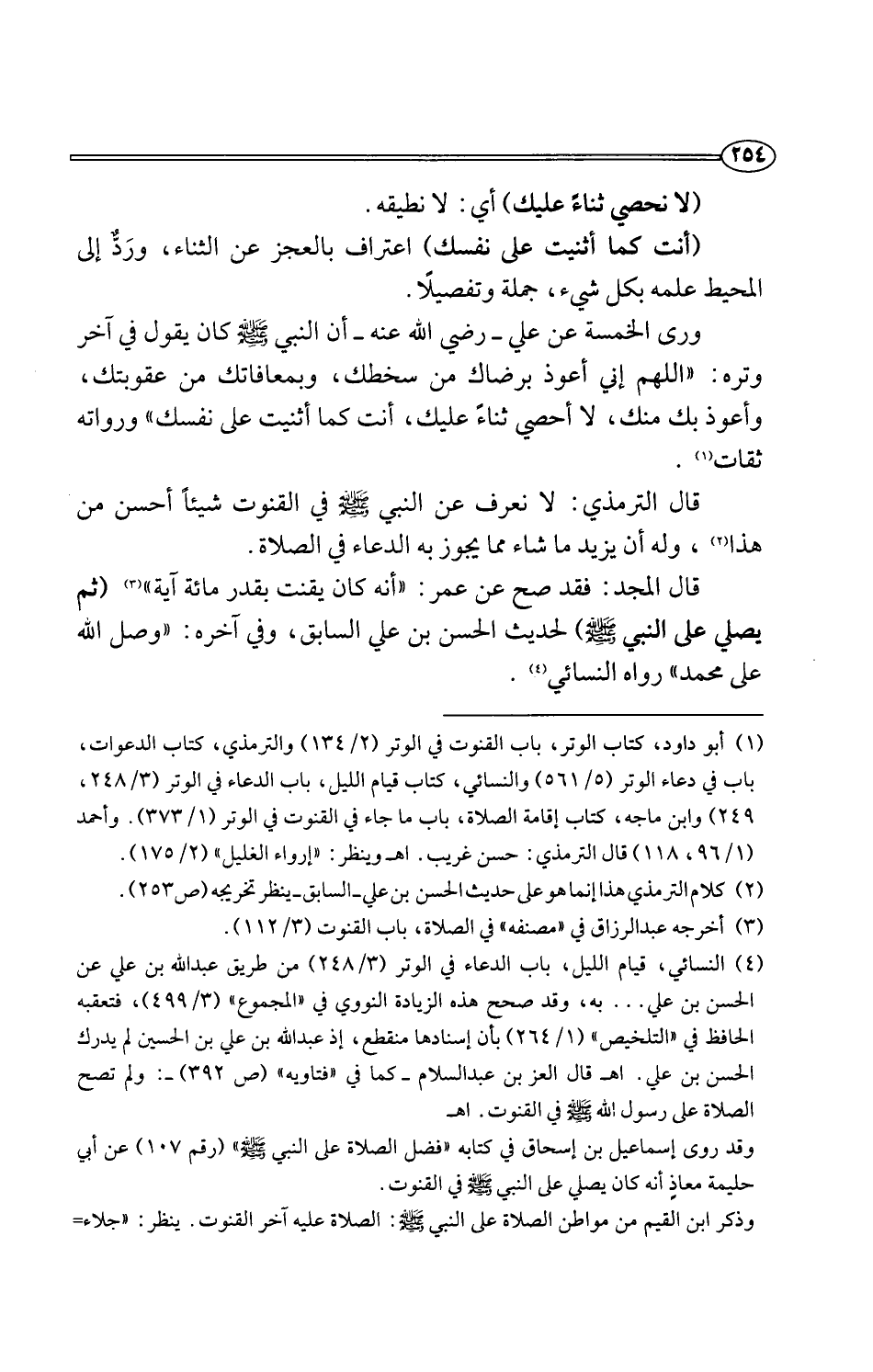 ورى الخمسة عن علي -رضي اللَّه عنه- أن النبي -صلى اللَّه عليه وسلم- يقول في آخر وتره: "اللهم إني أعوذ برضاك من سخطك، وبمعافاتك من عقوبتك، وأعوذ بك منك، لا أحصي ثناءً عليك، أنت كما أثنيت على نفسك" ورواته ثقات (¬1).