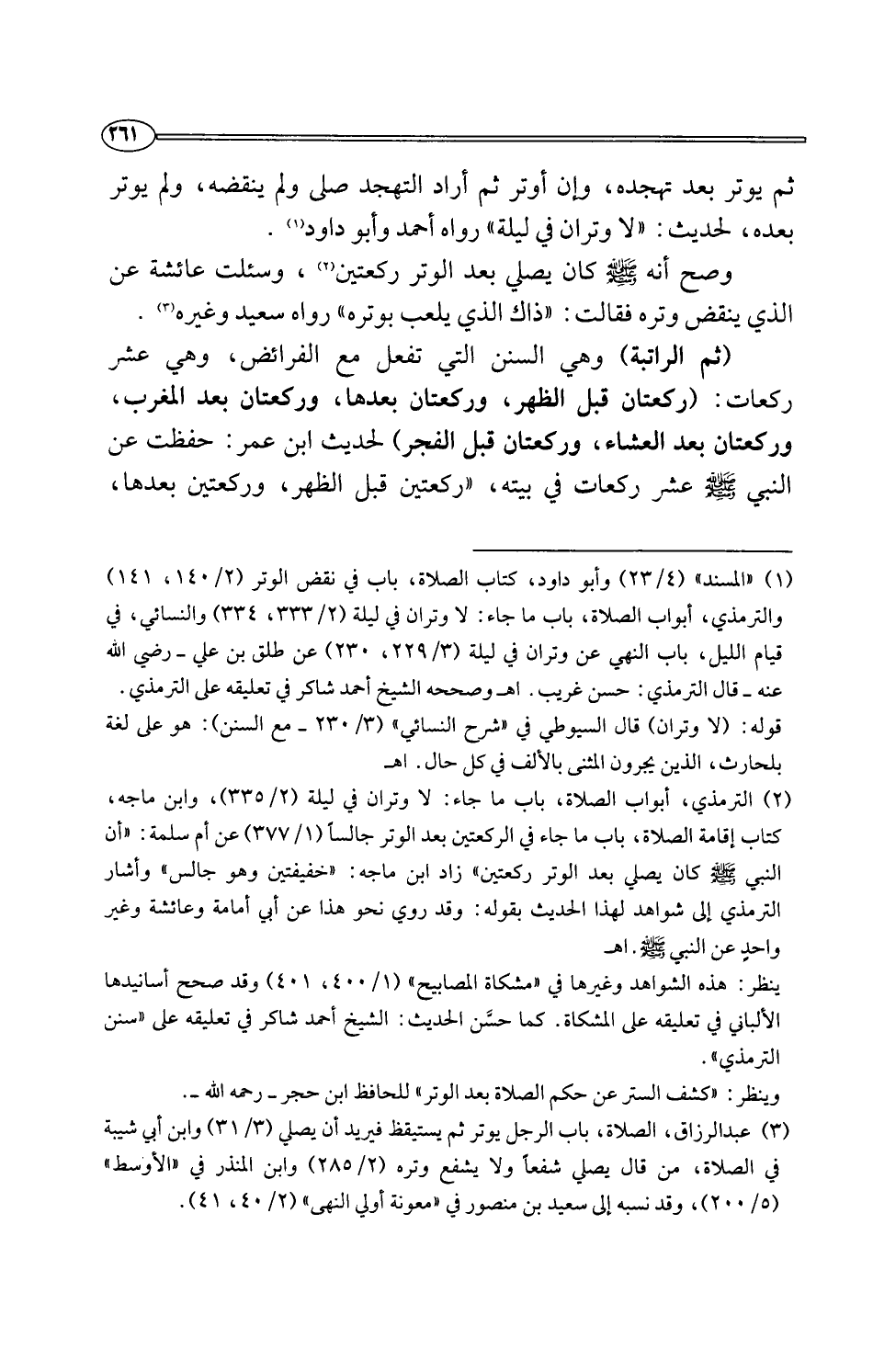 وصح أنه -صلى اللَّه عليه وسلم- كان يصلي بعد الوتر ركعتين (¬2)، وسئلت عائشة عن الذي ينقض وتره فقالت: "ذاك الذي يلعب بوتره" رواه سعيد وغيره (¬3).