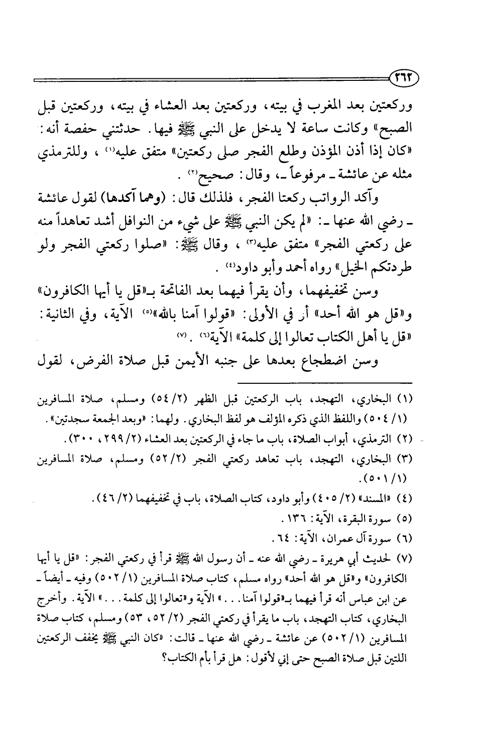 (¬7) لحديث أبي هريرة -رضي اللَّه عنه- أن رسول اللَّه -صلى اللَّه عليه وسلم- قرأ في ركعتي الفجر: {قُلْ يَاأَيُّهَا الْكَافِرُونَ} و {قُلْ هُوَ اللَّهُ أَحَدٌ} رواه مسلم، كتاب صلاة المسافرين (1/ 502) وفيه -أيضًا- عن ابن عباس أنه قرأ فيهما بـ {قُولُوا آمَنَّا. . .} الآية و {تَعَالَوْا إِلَى كَلِمَةٍ سَوَاءٍ. . .} الآية. وأخرج البخاري، كتاب التهجد، باب ما يقرأ في ركعتي الفجر (2/ 52، 53) ومسلم، كتاب صلاة المسافرين (1/ 502) عن عائشة -رضي اللَّه عنها- قالت: "كان النبي -صلى اللَّه عليه وسلم- يخفف الركعتين اللتين قبل صلاة الصبح حتى إني لأقول: هل قرأ بأم الكتاب؟