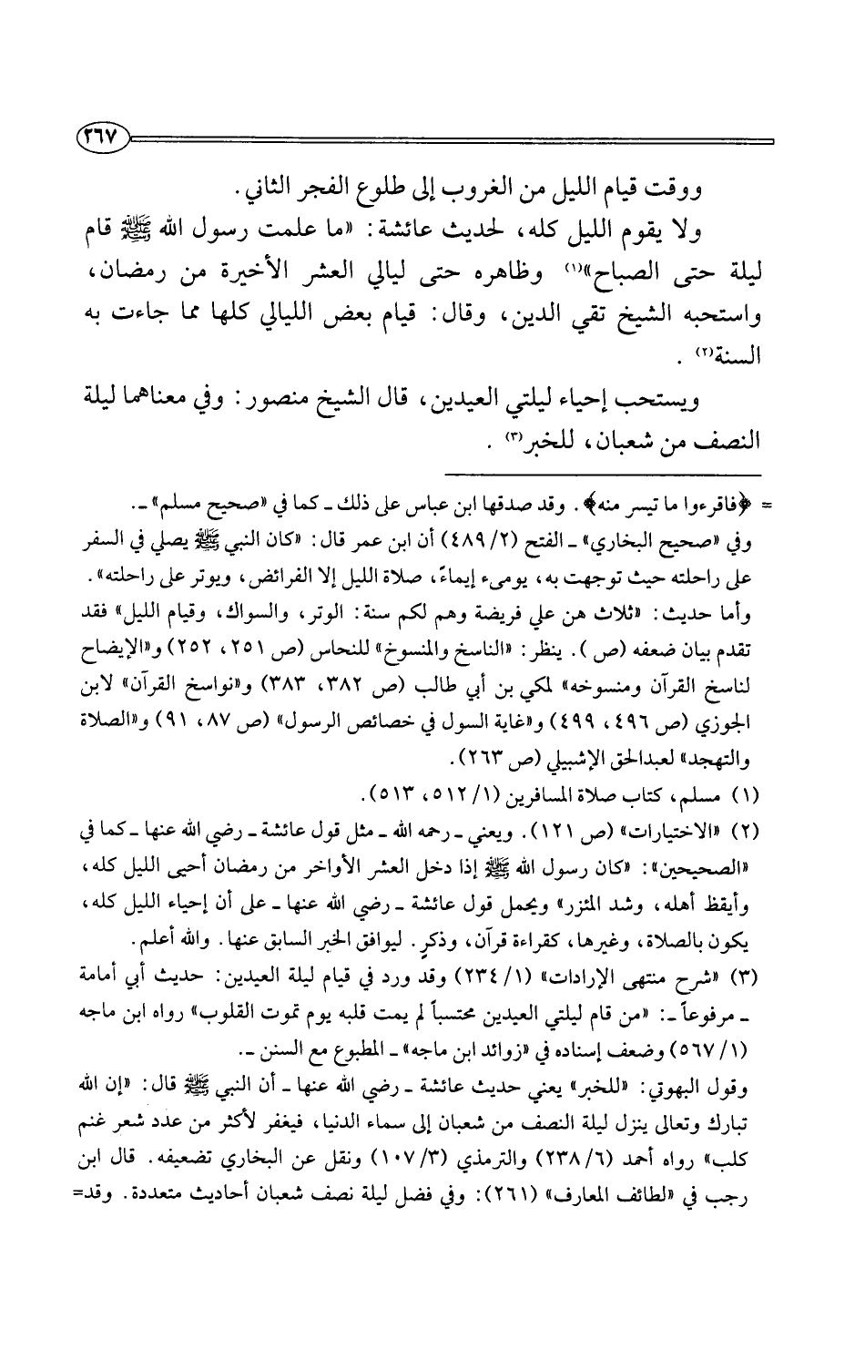 (¬3) "شرح منتهى الإرادات" (1/ 234) وقد ورد في قيام ليلة العيدين: حديث أبي أمامة -مرفوعًا-: "من قام ليلتي العيدين محتسبًا لم يمت قلبه يوم تموت القلوب" رواه ابن ماجه (1/ 567) وضعف إسناده في "زوائد ابن ماجه" -المطبوع مع السنن-.