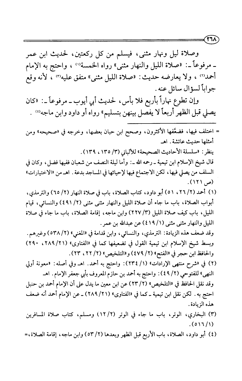 (¬1) أحمد (2/ 26، 51) أبو داود، كتاب الصلاة، باب في صلاة النهار (2/ 65) والترمذي، أبواب الصلاة، باب ما جاء أن صلاة الليل والنهار مثنى مثنى (2/ 491) والنسائي، قيام الليل، باب كيف صلاة الليل (3/ 227) وابن ماجه، إقامة الصلاة، باب ما جاء في صلاة الليل والنهار مثنى مثنى (1/ 419) عن عبد اللَّه بن عمر.