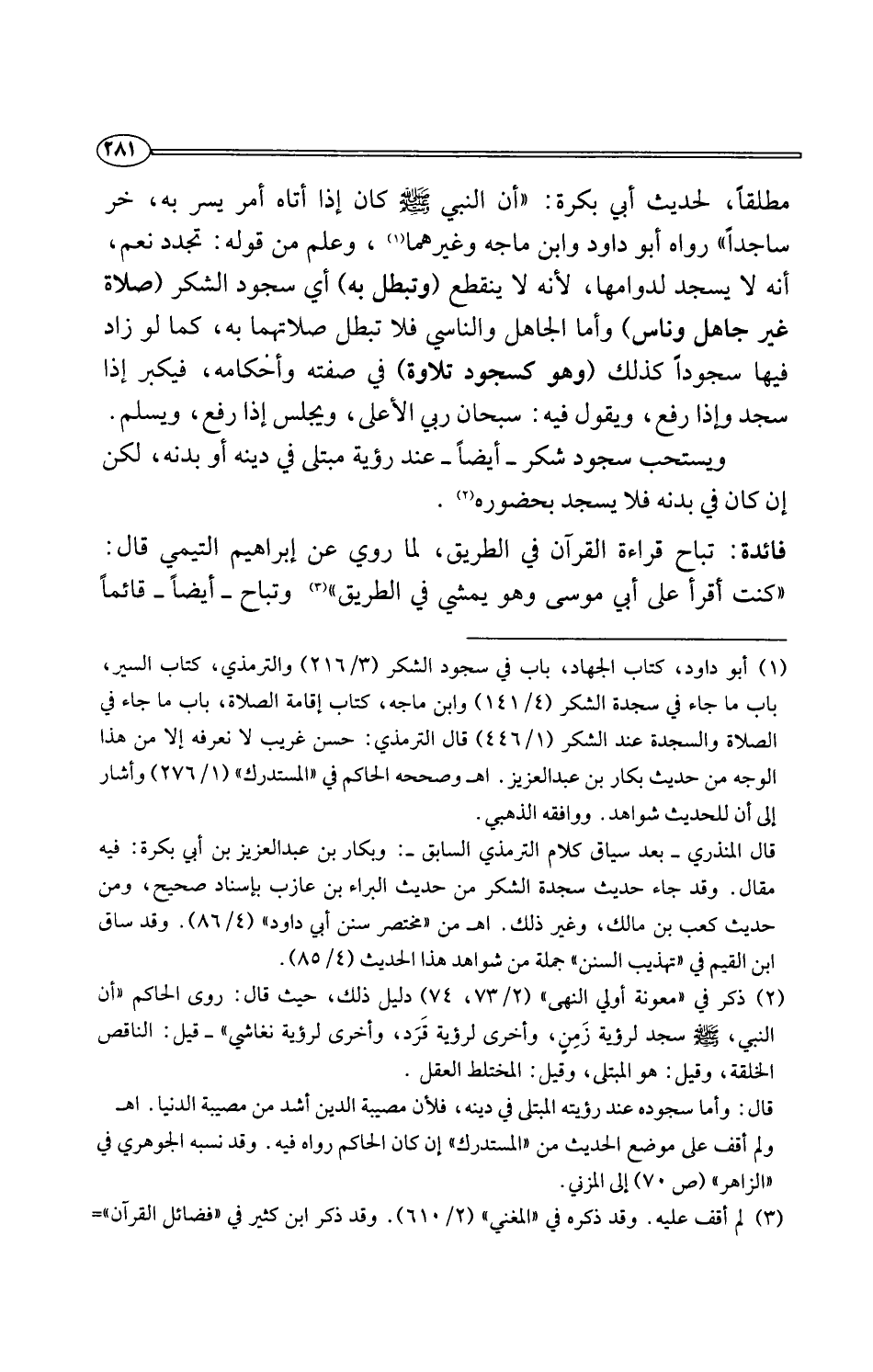 (¬2) ذكر في "معونة أولي النهى" (2/ 73, 74) دليل ذلك، حيث قال: روى الحاكم "أن النبي، -صلى اللَّه عليه وسلم- سجد لرؤية زَمِنٍ، وأخرى لرؤية قَرَد، وأخرى لرؤية نغاشي" -قيل: الناقص الخلقة، وقيل: هو المبتلى، وقيل: المختلط العقل.