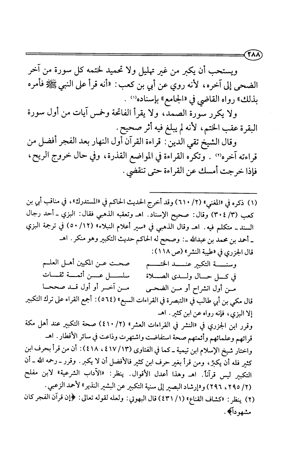 واختار شيخ الإسلام ابن تيمية -كما في الفتاوى (13/ 417، 418): أن من قرأ بحرف ابن كثير فله أن يكبِّر، ومن قرأ بغير حرف ابن كثير فالأفضل أن لا يكبر. وقرر -رحمه اللَّه- أن التكبير ليس قرآنًا. اهـ وهذا أعدل الأقوال. ينظر: "الآداب الشرعية" لابن مفلح (2/ 295، 296) و"إرشاد البصير إلى سنية التكبير عن الشير النذير" لأحمد الزعبي.