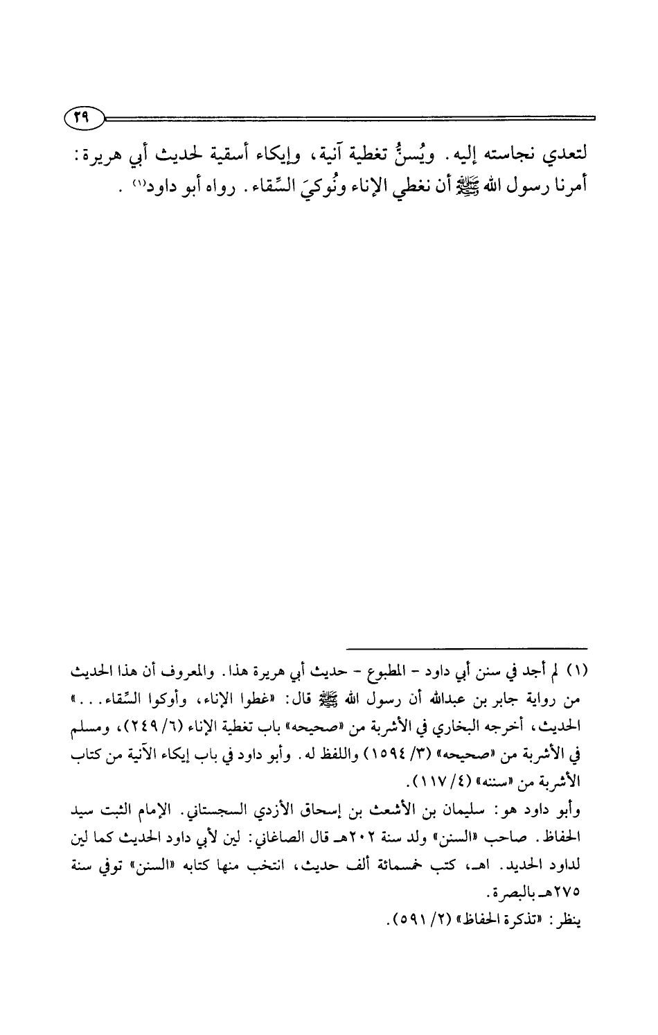(¬1) لم أجد في سنن أبي داود -المطبوع- حديث أبي هريرة هذا. والمعروف أن هذا الحديث من رواية جابر بن عبد اللَّه أن رسول اللَّه -صلى اللَّه عليه وسلم- قال: "غطوا الإناء، وأوكوا السِّقاء. . . " الحديث، أخرجه البخاري في الأشربة من "صحيحه" باب تغطية الإناء (6/ 249)، ومسلم في الأشربة من "صحيحه" (3/ 1594) واللفظ له. وأبو داود في باب إيكاء الآنية من كتاب الأشربة من "سننه" (4/ 117).