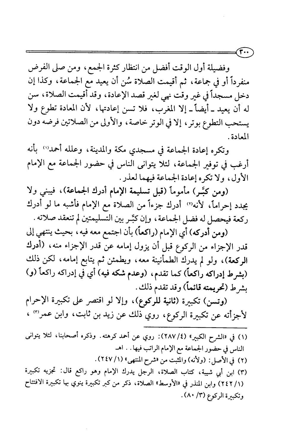 وفضيلة أول الوقت أفضل من انتظار كثرة الجمع، ومن صلى الفرض منفردًا أو في جماعة، ثم أقيمت الصلاة سُن أن يعيد مع الجماعة، وكذا إن دخل مسجدًا في غير وقت نهي لغير قصد الإعادة، وقد أقيمت الصلاة، سن له أن يعيد -أيضًا- إلا المغرب، فلا تسن إعادتها، لأن المعادة تطوع ولا يستحب التطوع بوتر، إلا في الوتر خاصة، والأولى من الصلاتين فرضه دون المعادة.